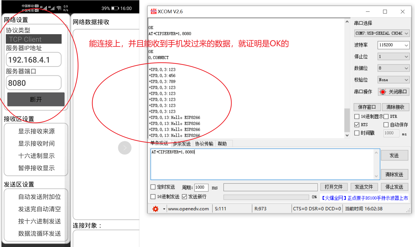 手机要连接好ESP8266的WIFI,如果可以连接上,并且串口调试助手收到了手机端发来的数据,那么就说明配置都是OK的,现在基本的手机和ESP8266通信已经完成了。
