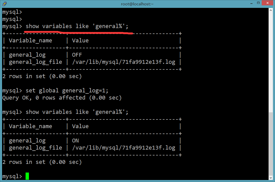 如果是通过命令方式开启的该功能,重启MYSQL后失效(这与其他配置是一致的),除非写在配置文件中。全局查询日志只用在测试环境,切记生产环境中永远不要开启该功能,这一点很重要!
