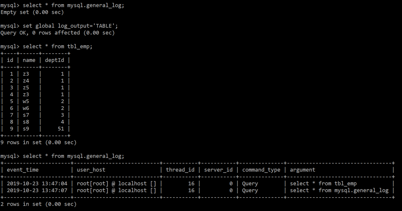 此后,你编写的SQL语句,将会记录到MySQL库里的general_log表,可使用下面的命令查看