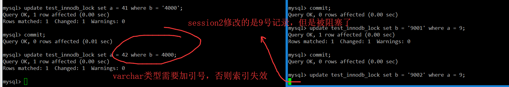 现在假设session1对b='4000' 这条记录做了修改,但是由于错误的写法导致索引失效: