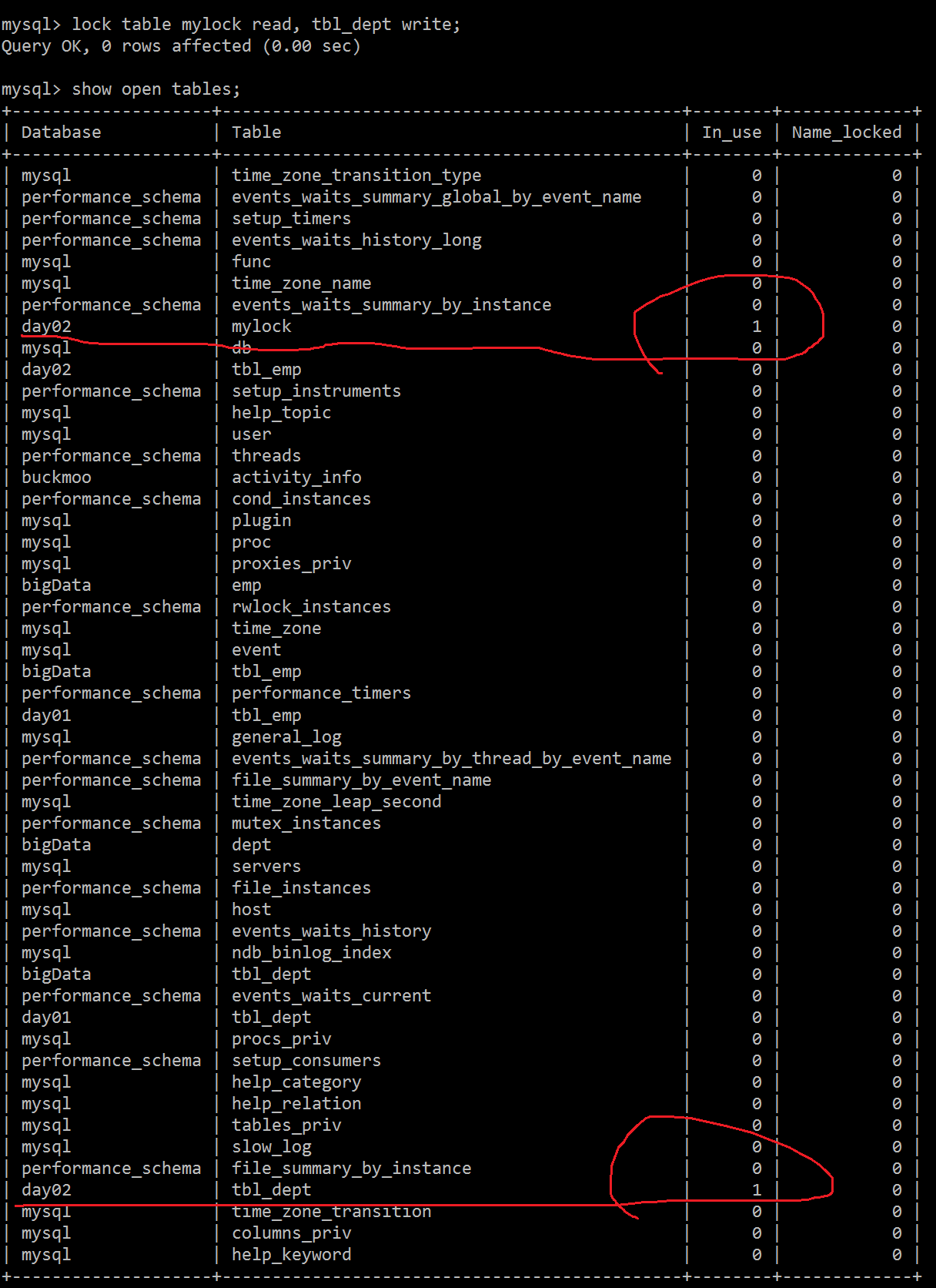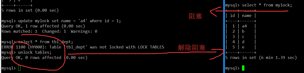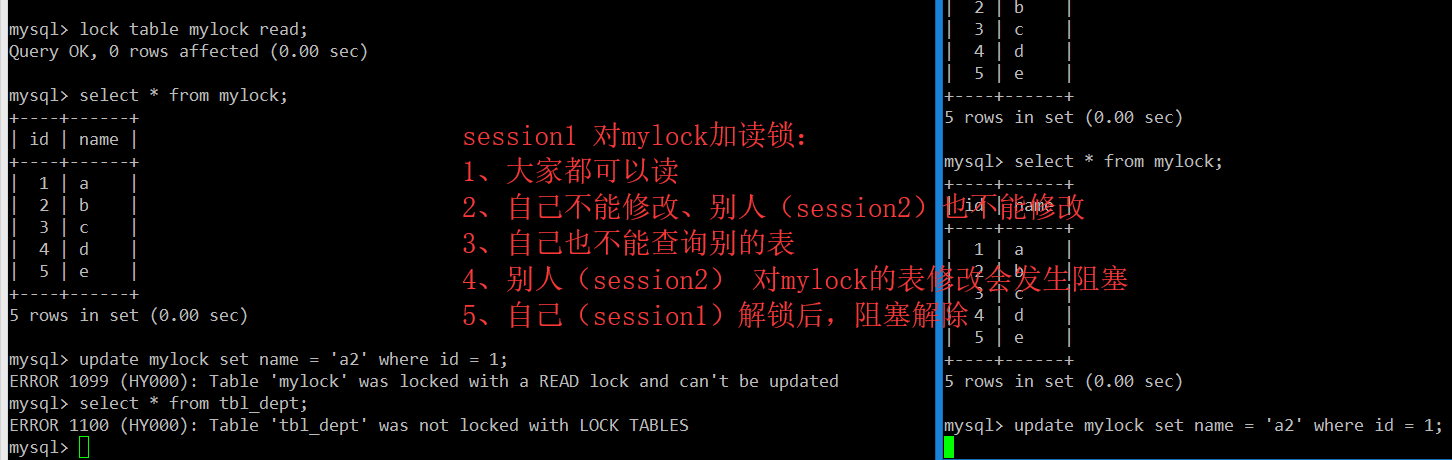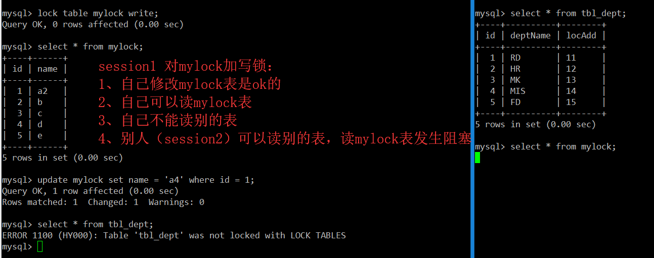 1、自己修改mylock表是ok的 2、自己可以读mylock表 3、自己不能读别的表 4、别人(session2)可以读别的表,读mylock表发生阻塞 5、别人(session2)更不能写mylock表了