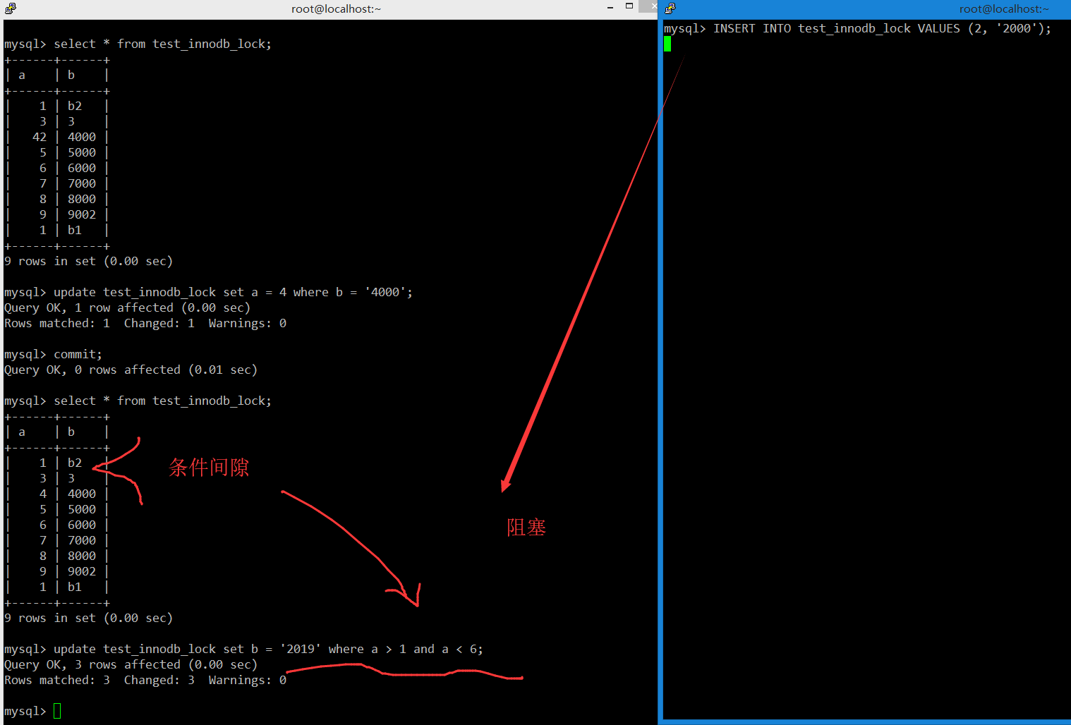 session1只是在更改一个范围的数据,session2只是在插入一条新的数据,但是同样发生了阻塞!