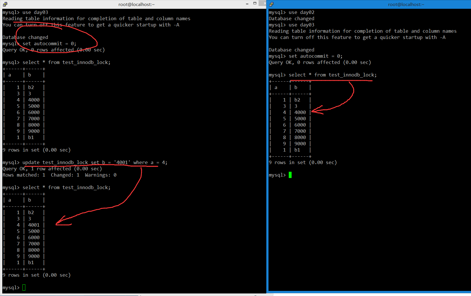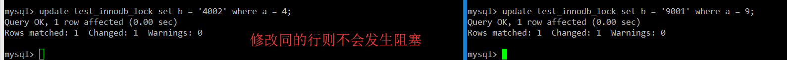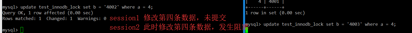 session1 修改第四条数据,未提交 session2 此时修改第四条数据,发生阻塞