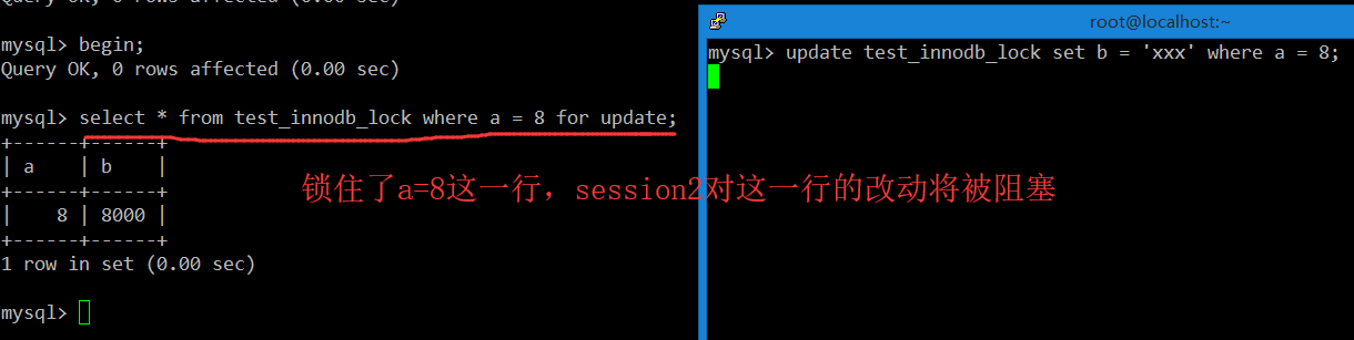 注意:如果在session2中出现查询并未被阻塞的情况,那就是MySQL直接从缓存中取得数据,在MySQL5.7 以后的版本中不会发生此问题!