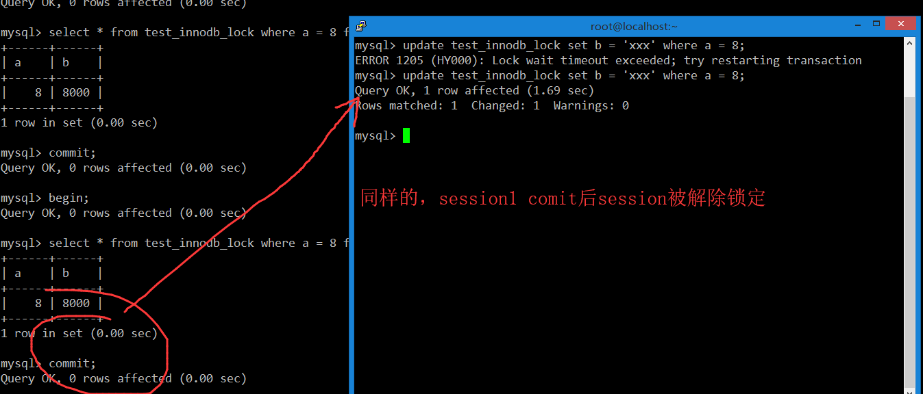 session1解除写锁,session2才可以解除被阻塞的状态: