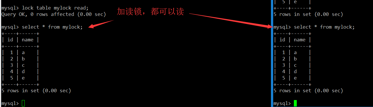 可以看出,session1对mylock加了读锁,大家都是可以读的。下面看看其他的情况: