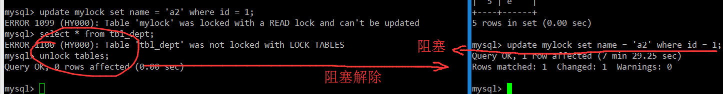 session1对mylock表加的读锁,从session2想修改mylock表的数据到session1解锁,也就是个7分29秒,哈哈这很致命!