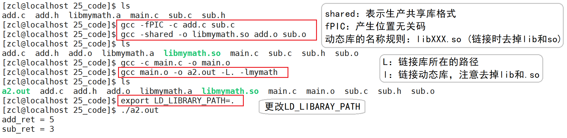 [zcl@localhost 25_code]$ gcc -shared -o libmymath.so add.o sub.o