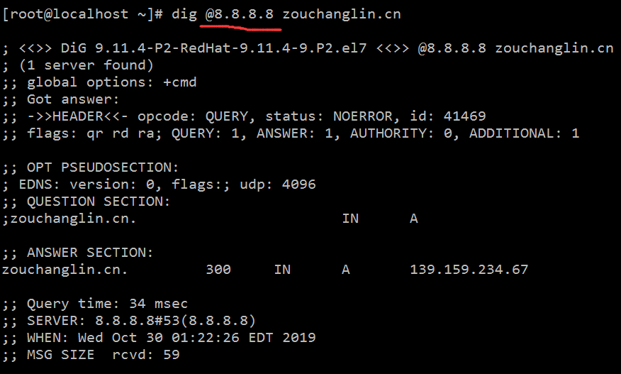 之后就可以使用 dig 指令查看域名解析过程了