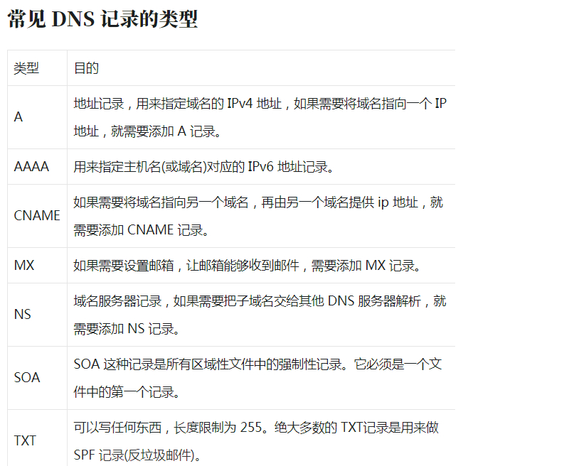 默认情况下 dig 命令查询 A 记录,上图中显示的 A 即说明查询的记录类型为 A 记录。在尝试查询其它类型的记录前让我们先来了解一下常见的 DNS 记录类型。