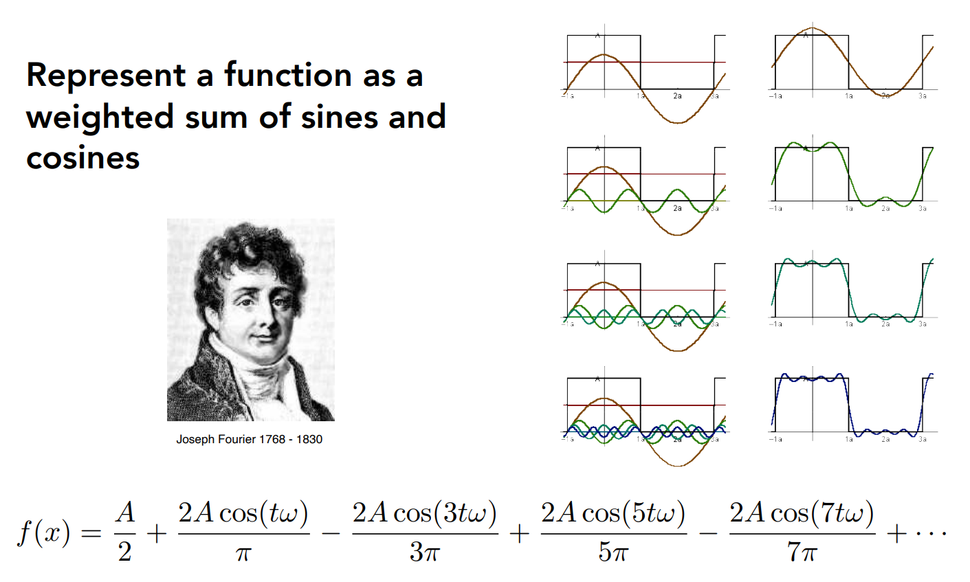 而傅里叶告诉我们,任意一个周期函数 $f(x)$ 可以由若干个频率不同、振幅不同的余弦函数相加而成。