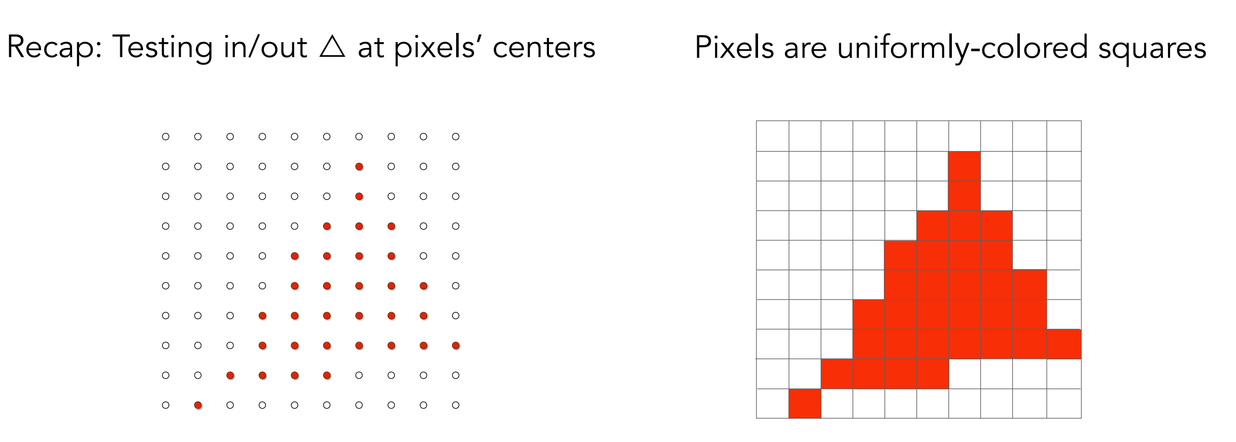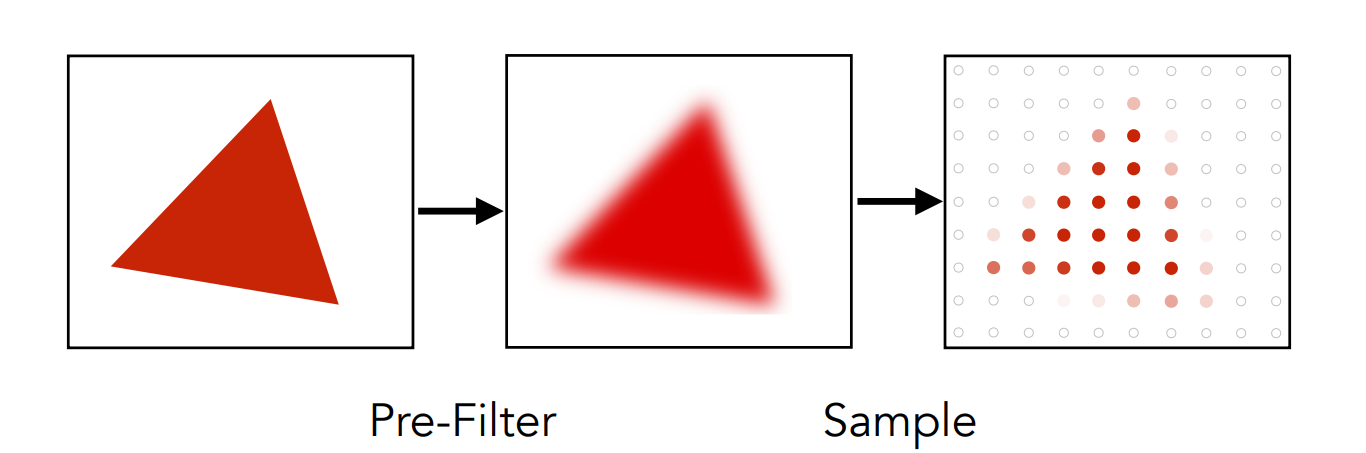 当我们把场景中的三角形光栅化显示到屏幕像素上时,会出现锯齿效果,其实很好理解,根据之前学习过的光栅化的流程,之前主要解决的是通过采样确定一个像素在不在这个三角形中的问题,现在要解决的就是锯齿问题。这类问题通常也叫做抗锯齿处理或者反走样(Antialiasing)。