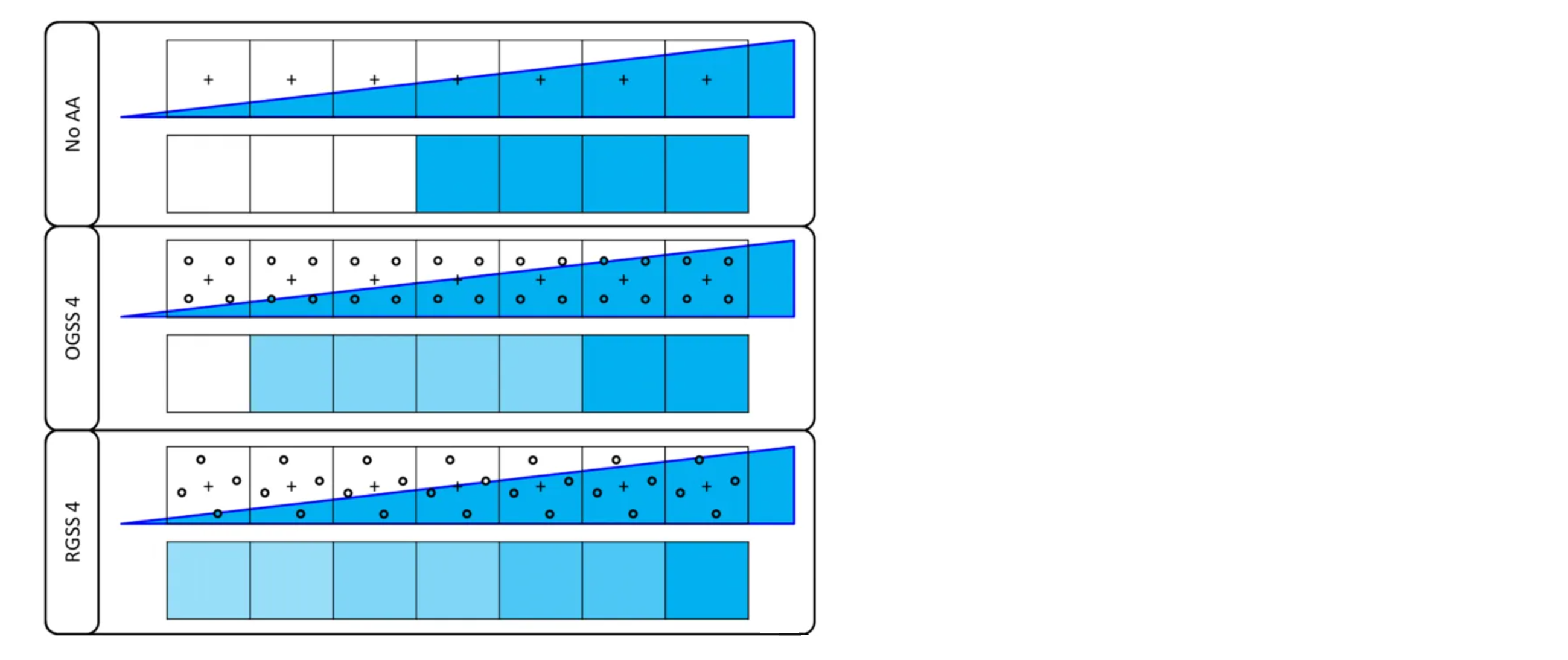从上图中可以看到,相当于将一个像素细化为四个采样点,此处的四个采样点分布有序且均匀,此类超采样称之为 OGSS(Ordered Grid Super-Sampling)。有研究者发现 OGSS 对于竖直和横向方向的超采样表现不太好(考虑到很多边缘都是竖直或者横向的),于是将四个采样旋转一个角度,得到 RGSS(Rotated Grid Super-Sampling),下图比较了 OGSS 与 RGSS 的表现: