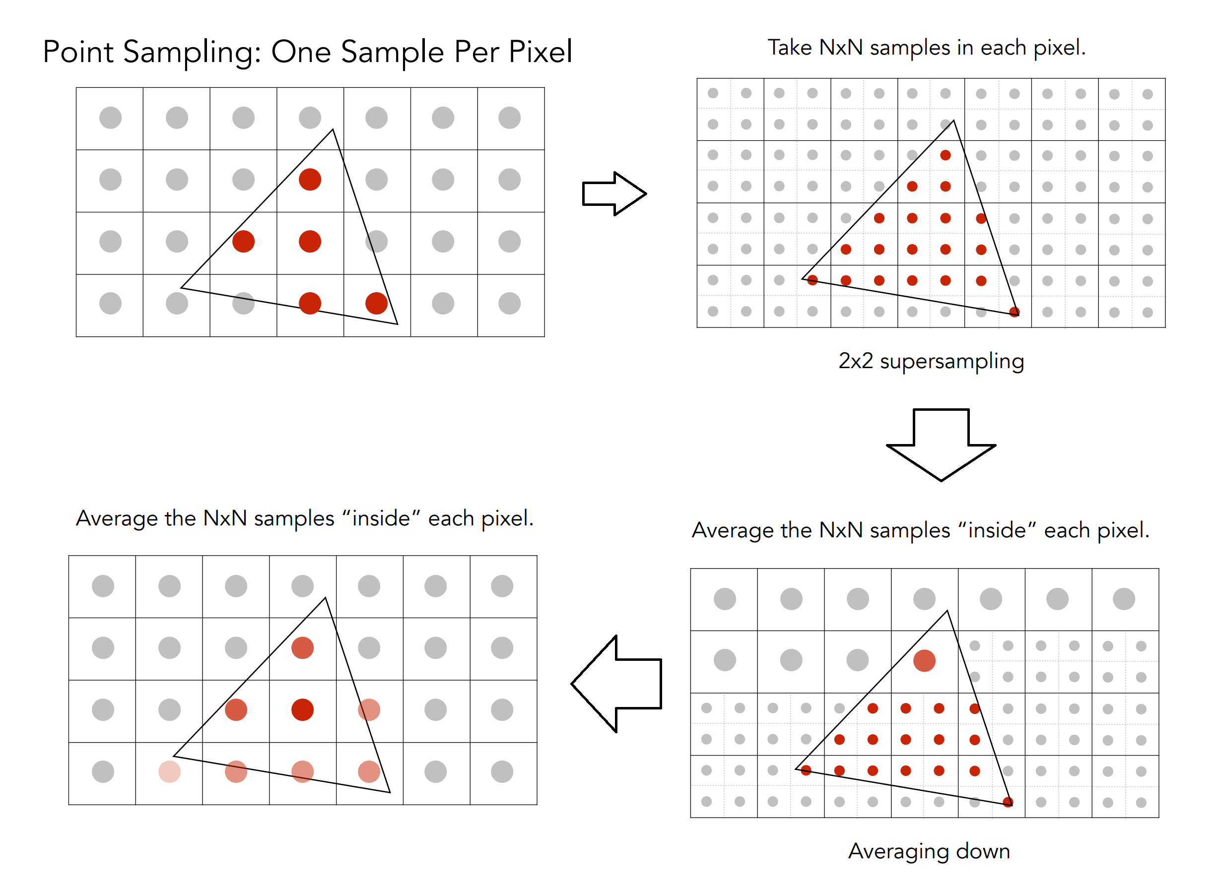 MSAA的做法也很容易理解,我们依然同样会分采样点,但是只会去计算究竟有几个采样点会被三角形覆盖, 相比 SSAA,MSAA 的优势是把采样点的深度、遮挡和光照计算分开,减少光照计算量。SSAA 是对每一个采样点都计算一次深度、遮挡和光照,最后才进行滤波解析,而 MSAA 只对每一个采样点计算深度、遮挡等,然后就滤波解析,最后对一个像素内的多个采样点只计算一次光照。
