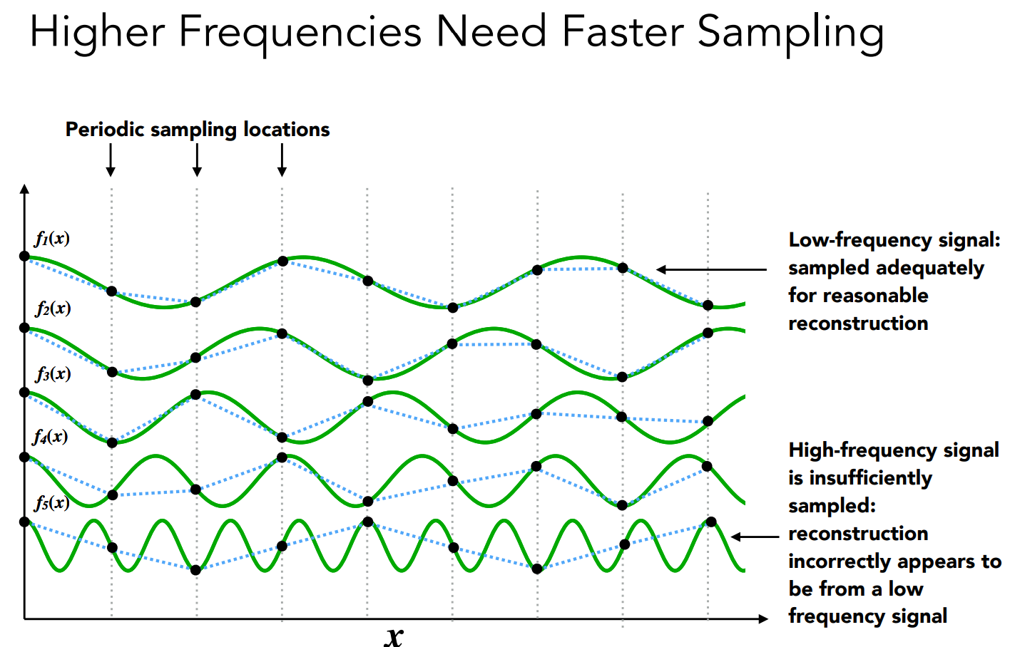 e^{i x}=\cos x+i \sin x $$ 当我们每隔一定间隔采样 $ f(x)$ ,实际上就是每隔一定间隔,分别采样这些组成信号的余弦波并相加起来。可以看到,低频余弦波的采样结果与实际余弦函数差别并不大,但是随着频率越来越高,余弦波的采样失真越来越严重: