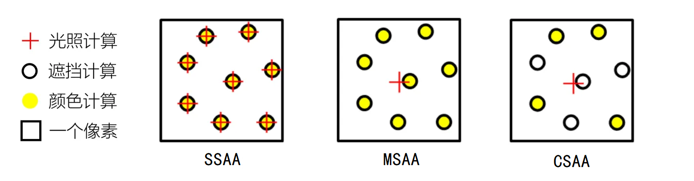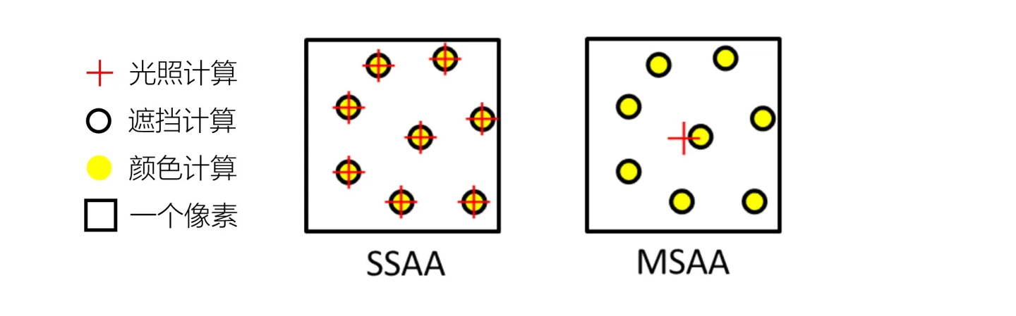 MSAA 相比 SSAA 少了很多的光照计算,所以速度提升不少,是使用最普遍的一种抗锯齿技术。