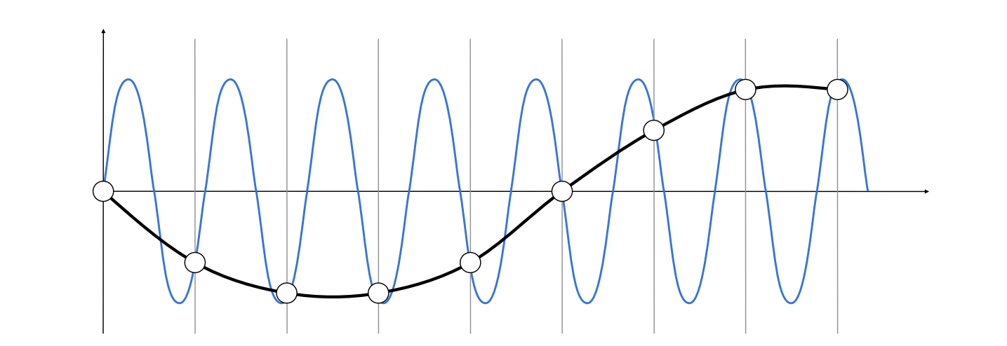 高频信号采样不足就被误认为是低频信号,在给定的采样中无法区分的两个频率,欠采样会产生频率混叠,比如下面的高频余弦波,本该是剧烈起伏的,采样的结果却是平缓起伏,与实际结果已经严重不一致: