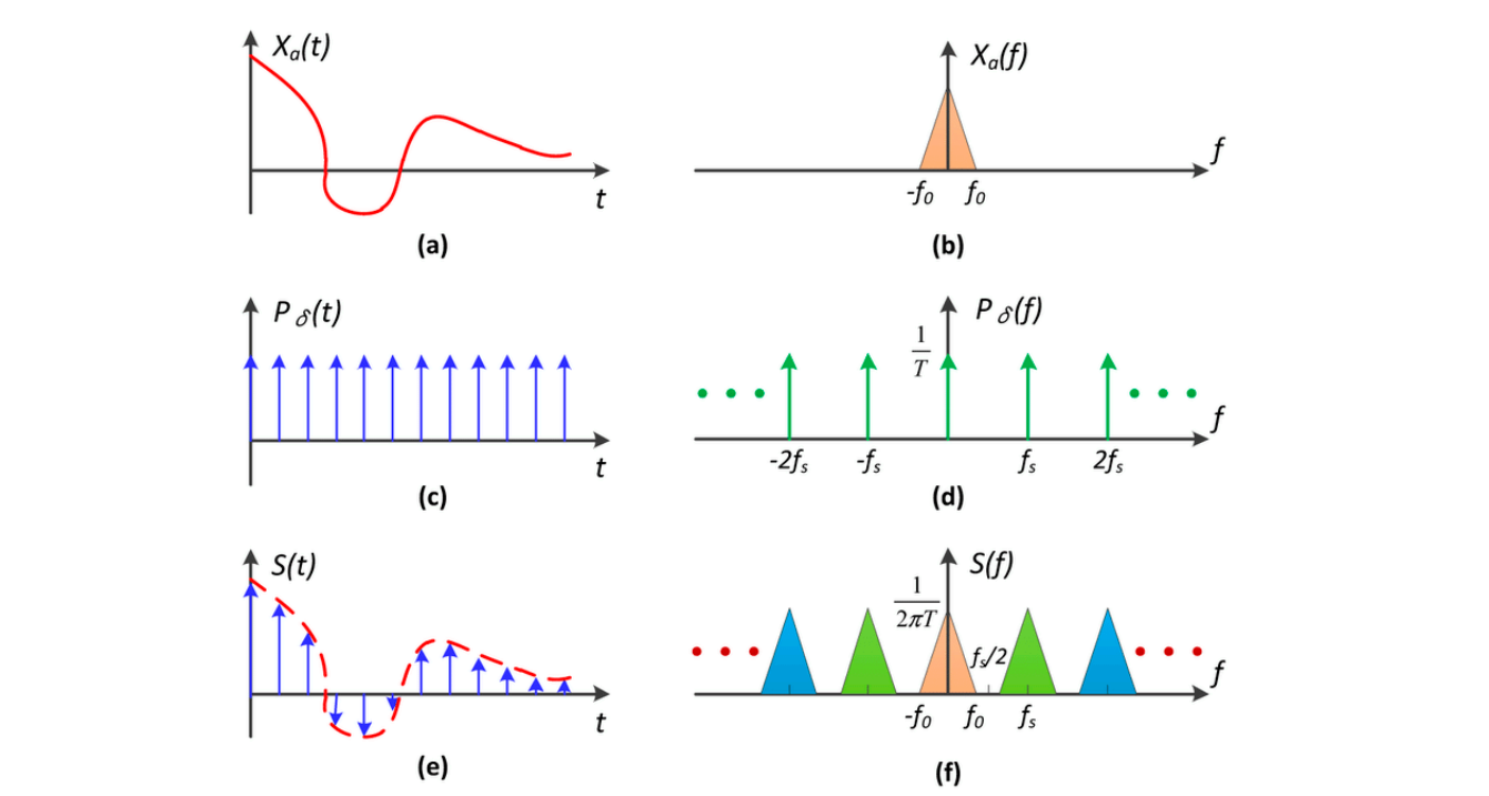 时域的离散化对应频域的周期化,下图中,c 作为一个一个的冲激函数乘以原函数 a 得到 e ,相当于把连续的函数给离散化了,对应到频域上是卷积操作,a、c 的频谱b和d做卷积,就得到了结果 f,其实就是把原函数的频谱 b 复制粘贴了很多份,然后经过一些过程将其转化为离散时间序列: