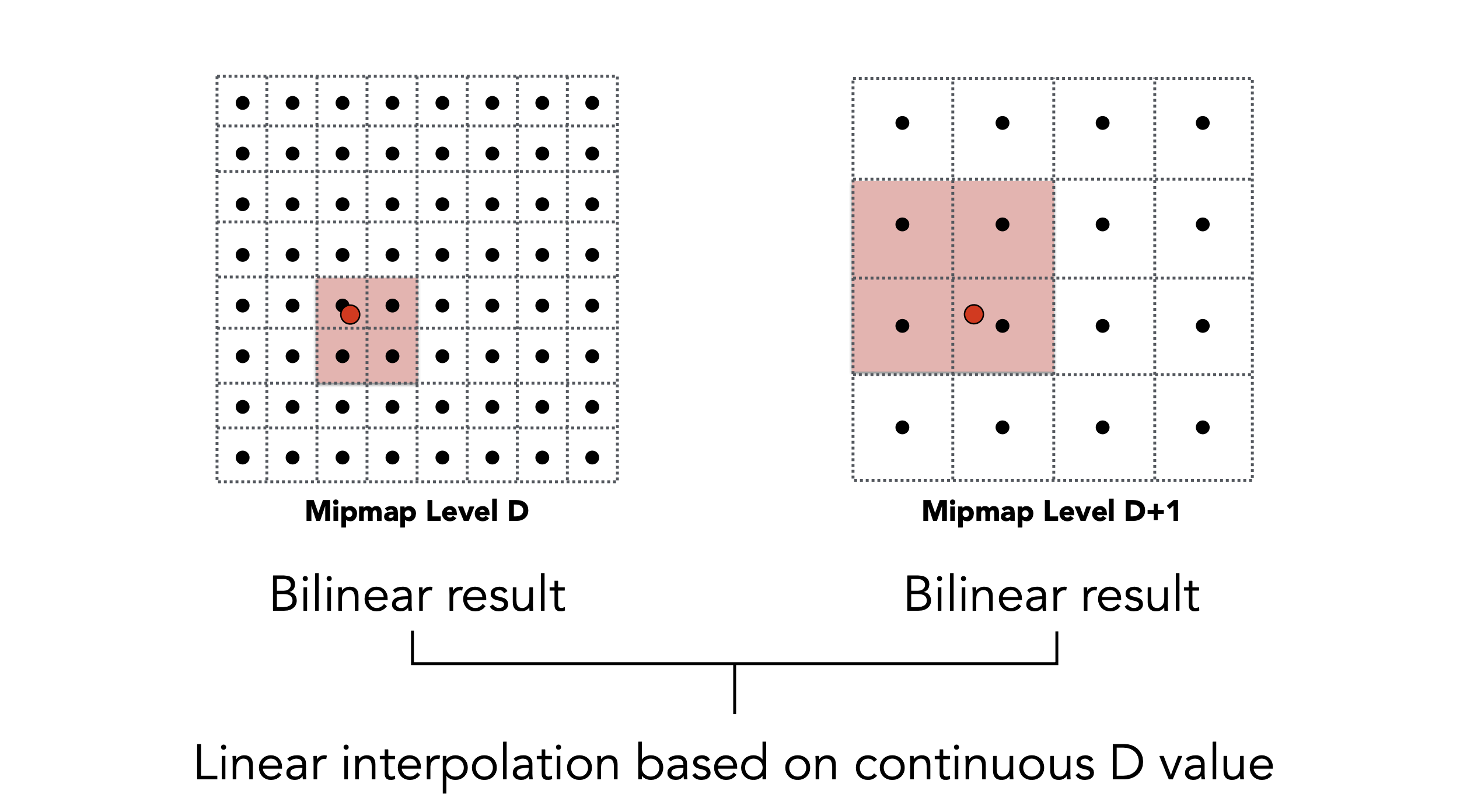 所谓3线性插值,就是在向下取整的 D level上进行一次双线性插值,再在D+1 level之上进行一次双线性插值,这二者数据再根据实际的连续 D 值在向下和向上取整的两个不同 level 之间的比例,再来一次线性插值,而这整体就是一个三线性插值了。