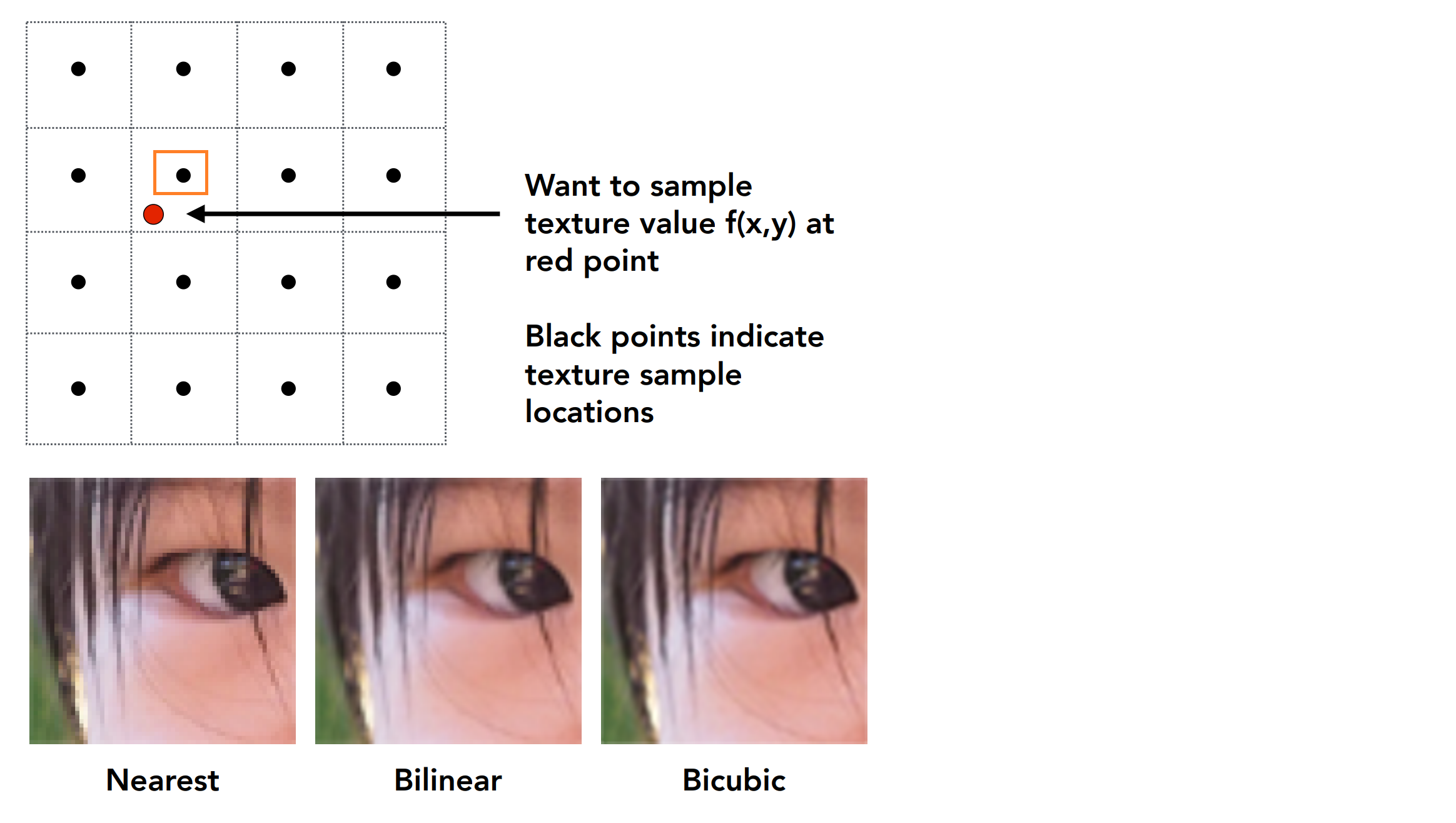 如图中红色点是屏幕空间下一像素所对应在 texture 空间中的点,会去选择离他最近的那个橙色框起来的点。