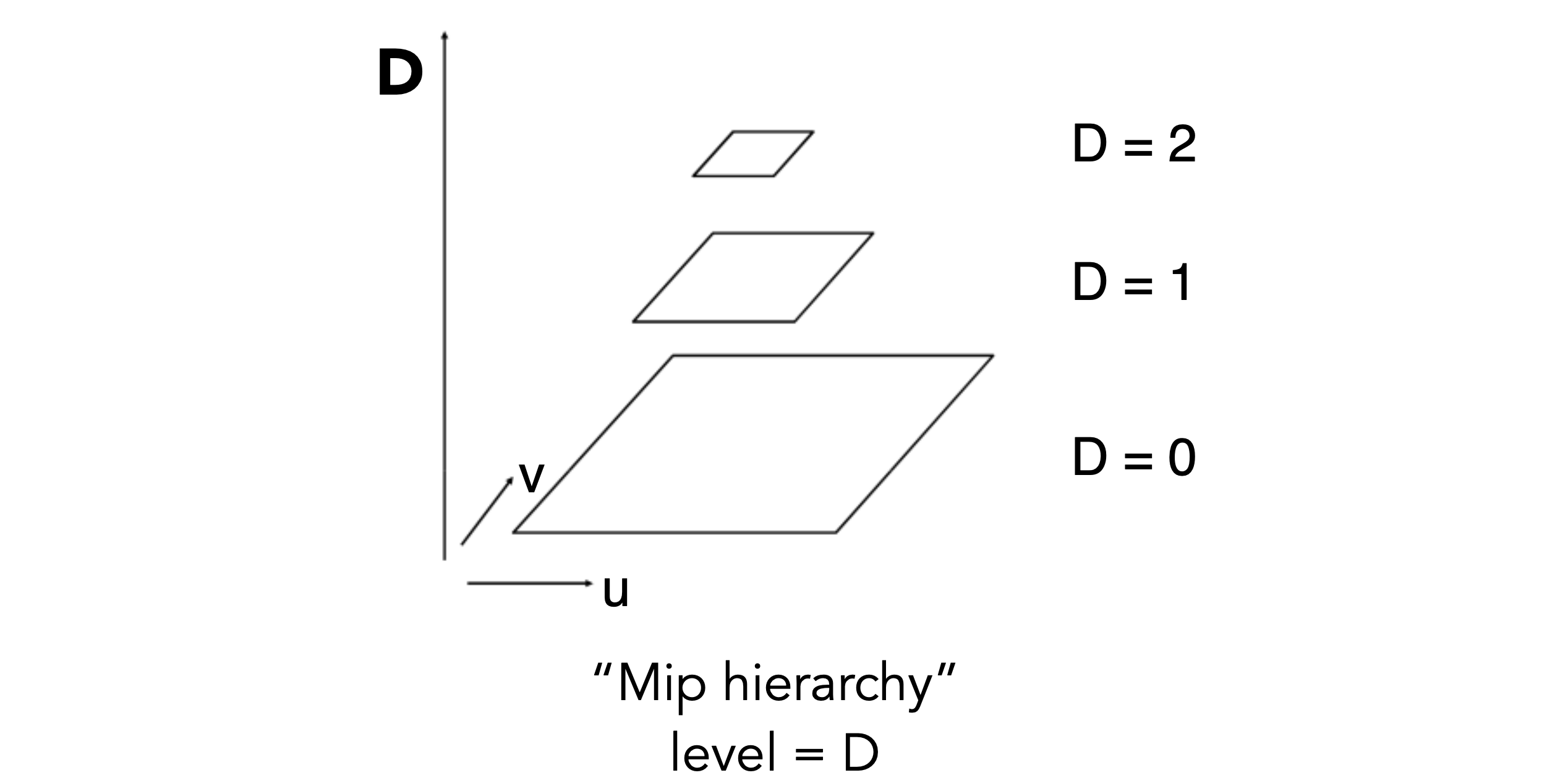 level 0 代表的是原始 texture,也是精度最高的纹理,随着level的提升,每提升一级将4个相邻像素点求均值合为一个像素点,因此越高的 level 也就代表了更大的 footprint 的区域查询。接下来要做的就是根据屏幕像素的 footprint 大小选定不同 level 的 texture,再进行点查询即可,而这其实就相当于在原始 texture 上进行了区域查询。