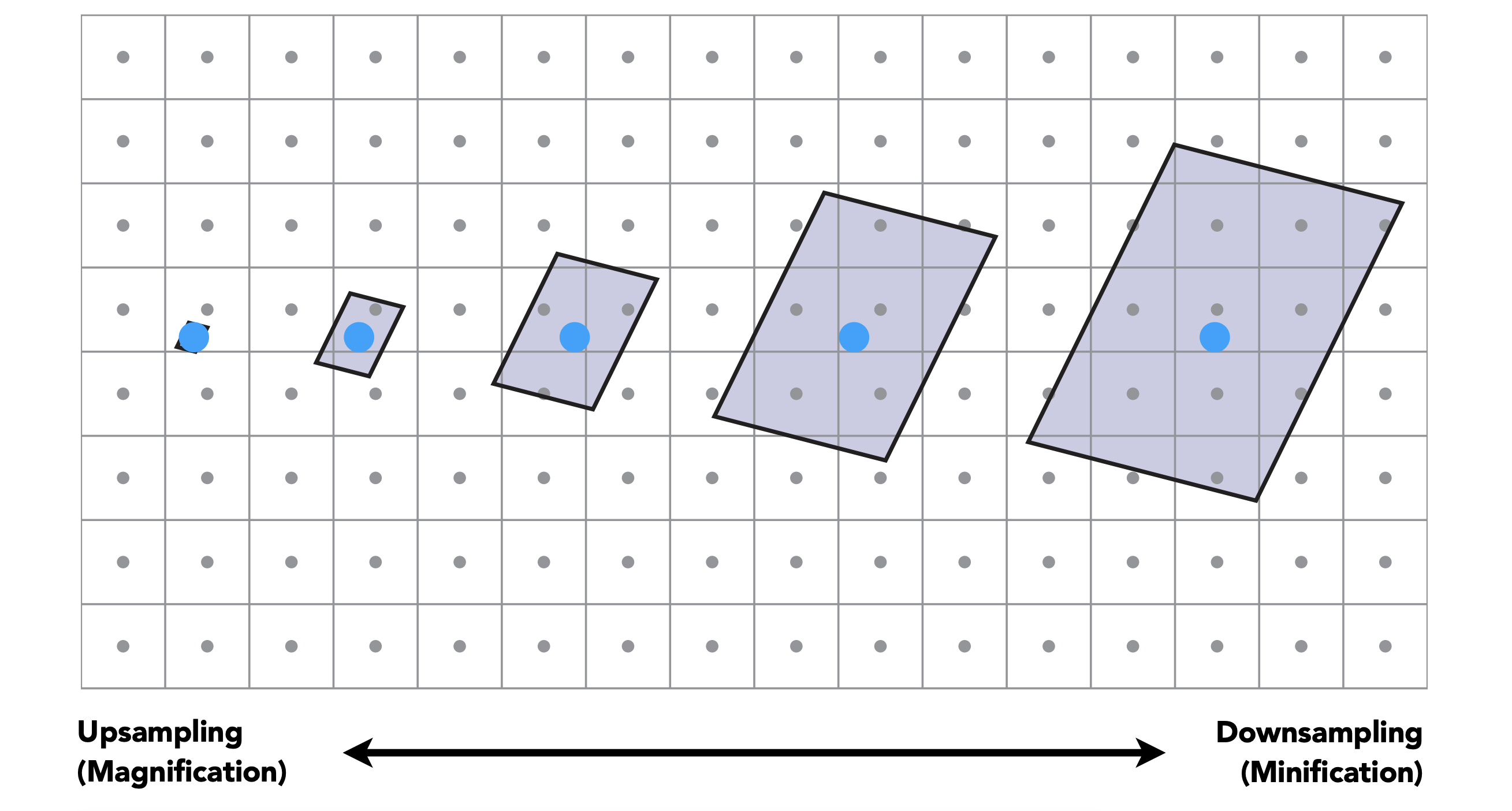 一个采样点的颜色信息不足以代表 footprint 里一个区域的颜色信息,如果可以求出这样一个区域里面所有颜色的均值,是不是就是一种可行的方法呢?没错我们的目标就是从点查询 Point Query 迈向区域查询 Range Query。但依然存在一个问题,从上图不难看出,不同的屏幕像素所对应的 footprint size是不一样大小的,看下图这样一个例子: