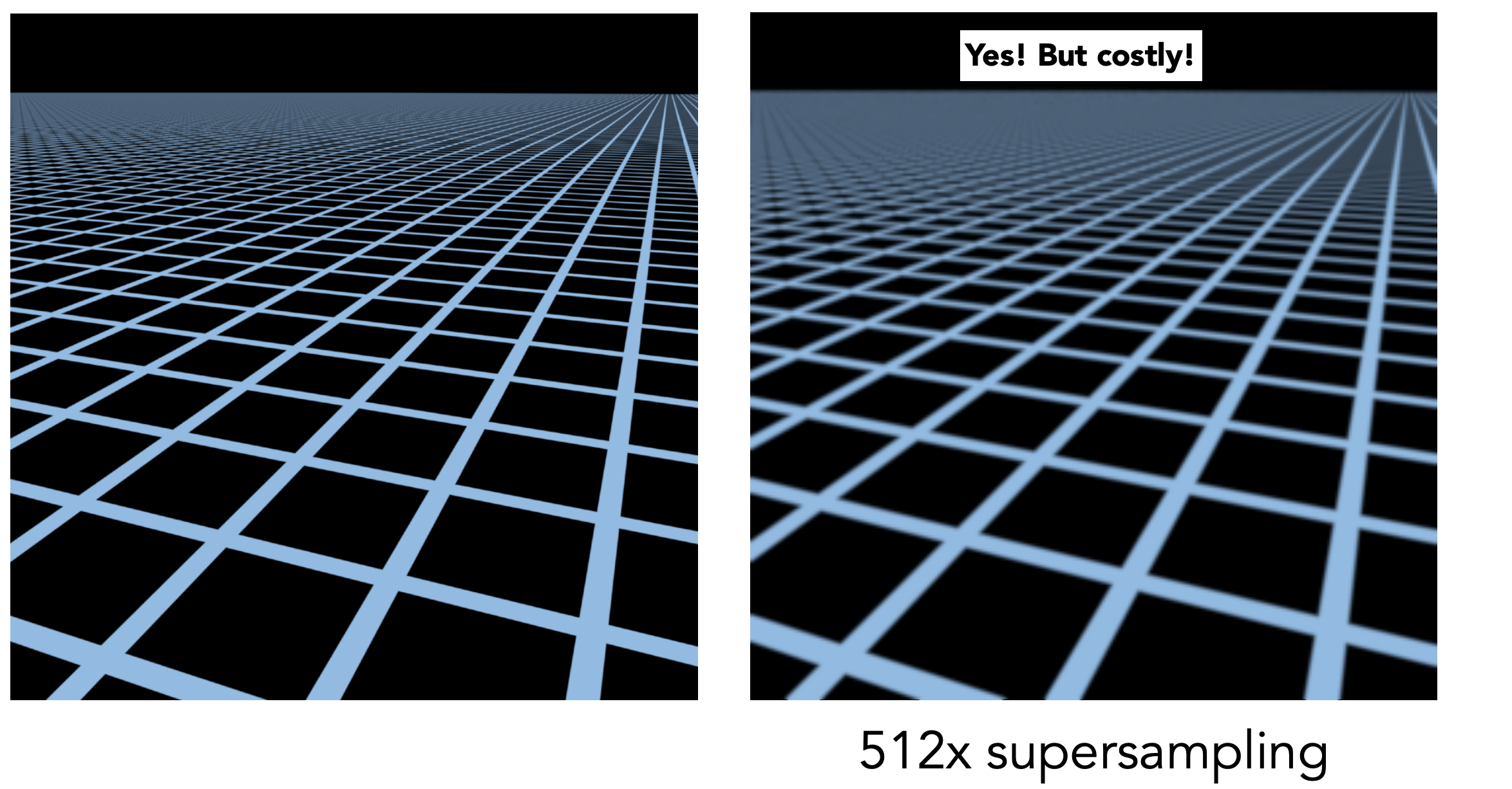 如上图所示:这种现象被形象的成为屏幕像素在texture空间的footprint(覆盖区),一个屏幕空间的蓝色像素点离相机越远,对应在 texture 空间的范围也就越大。其实也就是越来越欠采样,那么一种直观的解决方法就是Supersampling,如果一个像素点不足以代表一个区域的颜色信息,那么便把一个像素细分为更多个小的采样点不就可以解决这个问题了吗?对,确实是这样,可以看看如下图 512x 超采样的结果: