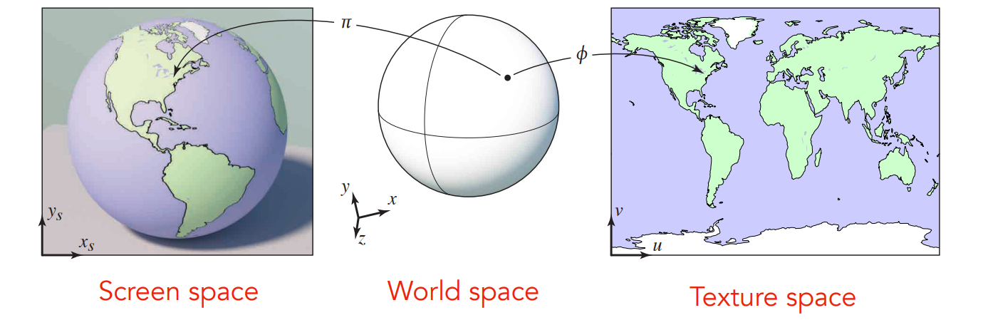 先来看看纹理映射的概念,我们可以将三维物体上的任意一个点都映射到一个二维平面之上,反之我们可以把二维平面上的像素映射到3D物体上,这就是纹理映射。举一个简单例子,地球仪: