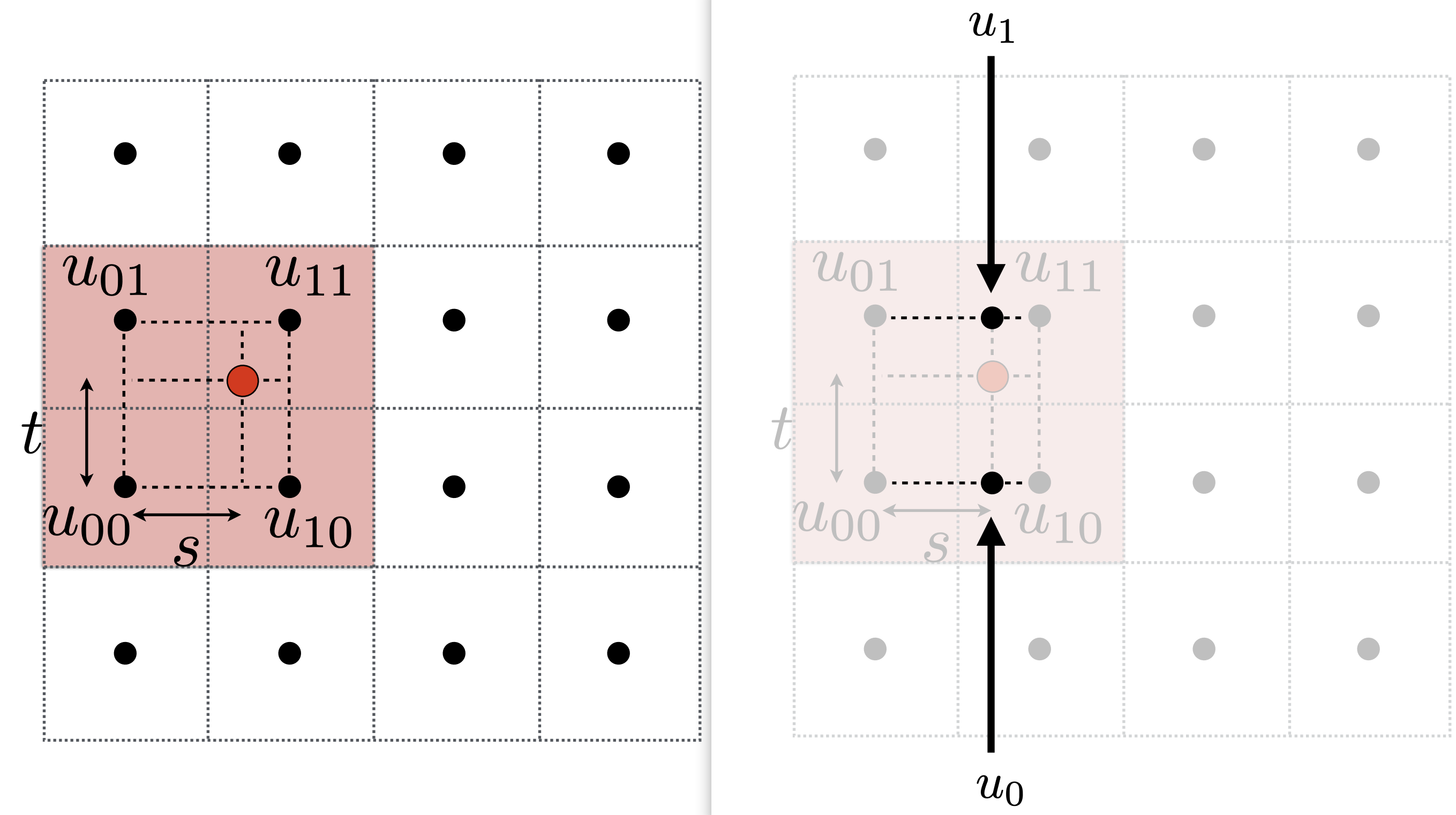 $$ \begin{array}{l} u_{0}=\operatorname{lerp}\left(s, u_{00}, u_{10}\right) \ u_{1}=\operatorname{lerp}\left(s, u_{01}, u_{11}\right) \end{array} $$
