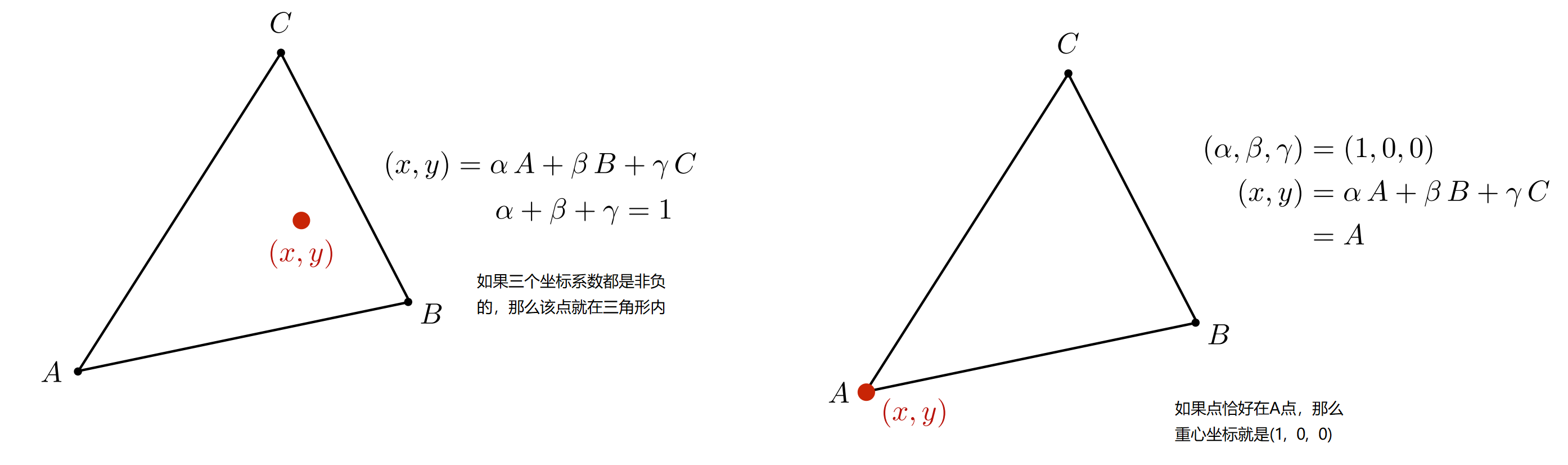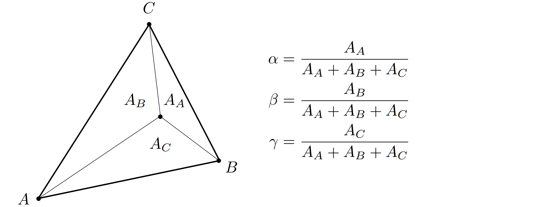 将一点 $(x,y)$ 与 A, B, C 三点直接连接,构成三个三角形面积分别为 $A_A , A_B , A_C$ 即可直接定义出重心坐标如图中公式所示。如果这个点在某个边的外侧,那么该点与这条边构成的三角形面积计算为负值。
