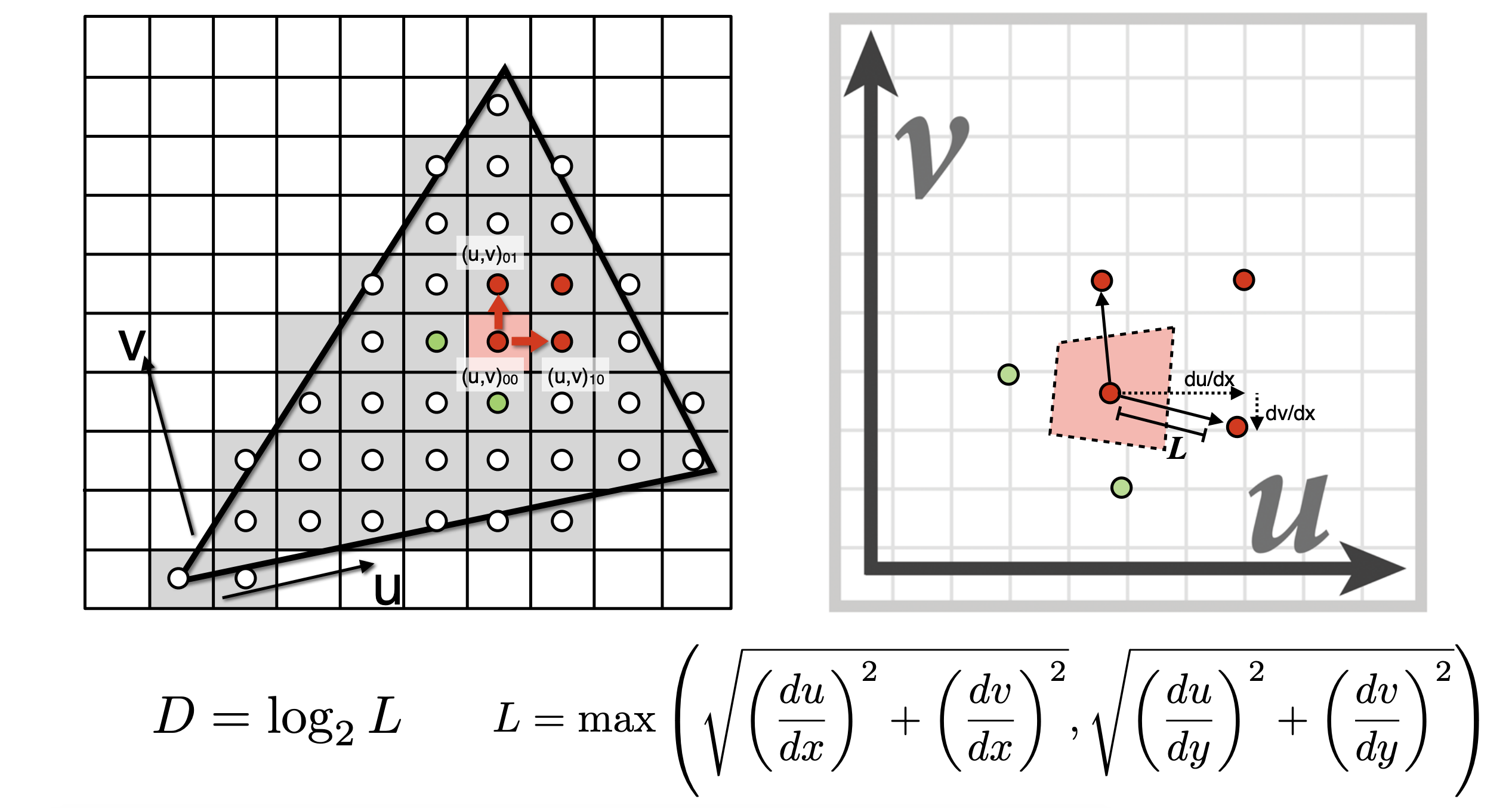 在屏幕空间中取当前像素点的右方和上方的两个相邻像素点(4个全取也可以),分别查询得到这3个点对应在Texture space的坐标,计算出当前像素点与右方像素点和上方像素点在 Texture space 的距离,二者取最大值,计算公式如图中所示,那么level D就是这个距离的log2值 (D = log2L) ! 这不难理解,读者可以具体取几个例子比如 L = 1,L = 2,L = 4,看看是否符合这样的计算即可。