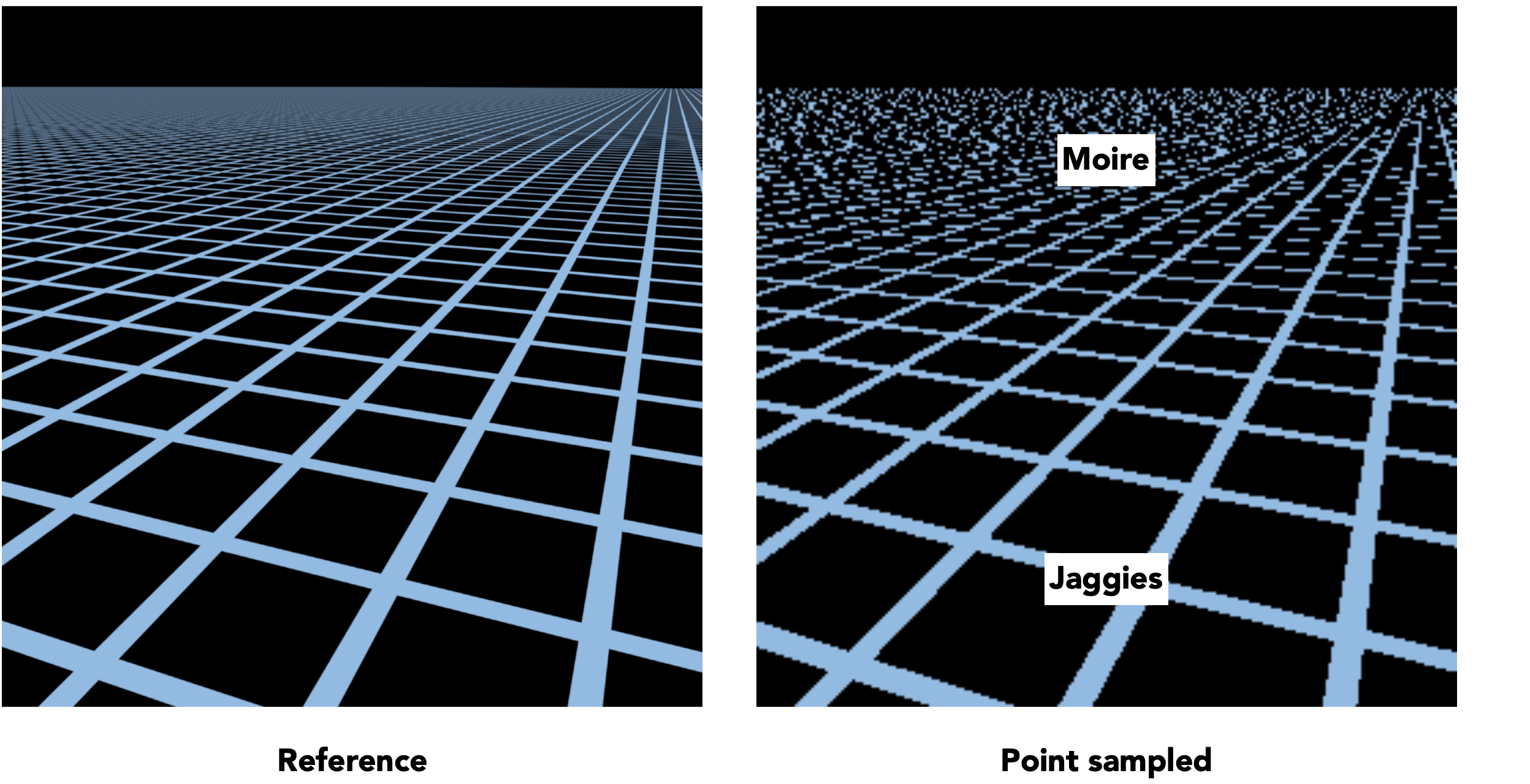 1、如开头所说,地板上铺满了重复的方格贴图,根据近大远小,远处的一张完整的贴图可能在屏幕空间中仅仅是几个像素的大小,那么必然屏幕空间的一个像素对应了纹理贴图上的一片范围的点,这其实就是纹理过大所导致的,直观来说想用一个点采样的结果代替纹理空间一片范围的颜色信息,必然会导致严重失真!从信号的角度来说就是,采样频率过低无法还原信号原貌。