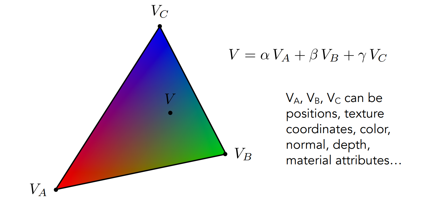 重心坐标在图形学中最重要的运用便是插值,他可以根据三个顶点 A、B、C 的属性插值出任意点的属性,无论是位置,颜色,深度,法线向量等等,而这些属性在之后的着色或是消除隐藏曲面都有很大的作用。