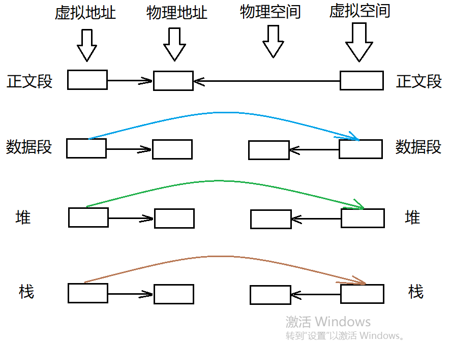 现在有一个父进程P1,这是一个主体,那么它是有灵魂也就身体的。现在在其虚拟地址空间(有相应的数据结构表示)上有:正文段,数据段,堆,栈这四个部分,相应的,内核要为这四个部分分配各自的物理块。即:正文段块,数据段块,堆块,栈块。至于如何分配,这是内核去做的事,在此不详述。