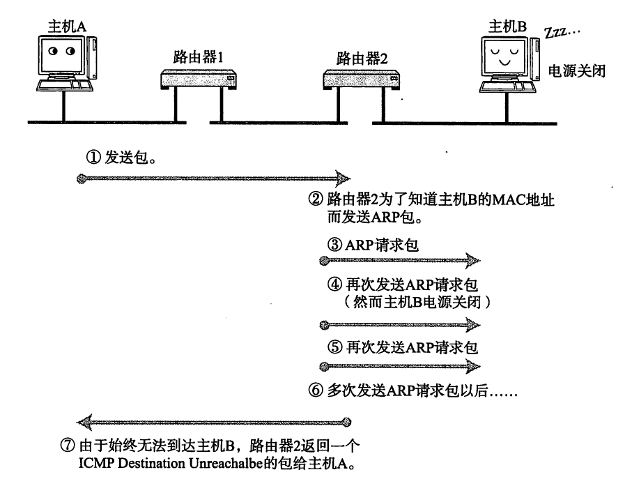 很好理解,如果主机A向B发送了报文,中途的路由器2却未发现主机B的存在,这个时候,路由器2便向A主机发送一个ICMP包,说明未能发往B主机:
