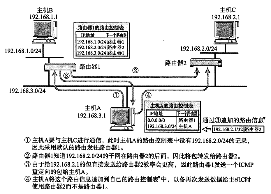 2、ICMP重定向消息 如果路由器发现发送端主机使用了次优的路径发送数据,那么它会返回一个ICMP重定向(ICMP Redirect Message)的消息给这个主机。在这个消息中包含了最合适的路由信息和源数据。这主要发生在路由器持有更好的路由信息的情况下。路由器会通过这样的ICMP消息给发送端主机一个更合适的发送路由,但是这样做很容易成为引发问题的原因,一般不这么干。