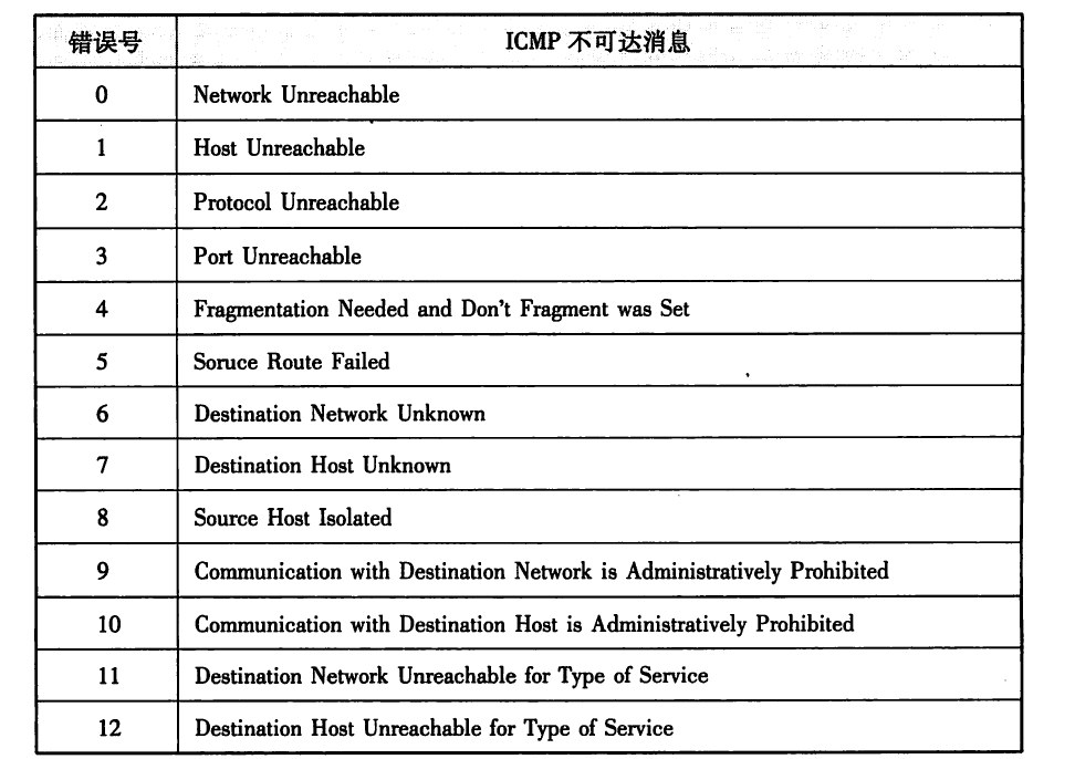 IP路由器无法将IP数据包发送给目标地址时,会给发送端主机返回一个目标不可达( Destination Unreachable Message)的ICMP消息,并在这个消息中显示不可达的具体原因: