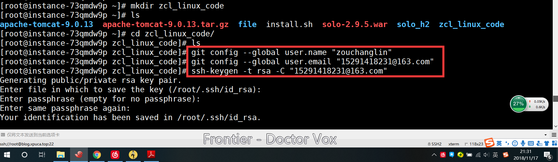 第一步:设置用户名和邮箱,并且生成秘钥 不要密码的话直接一直Enter就行!