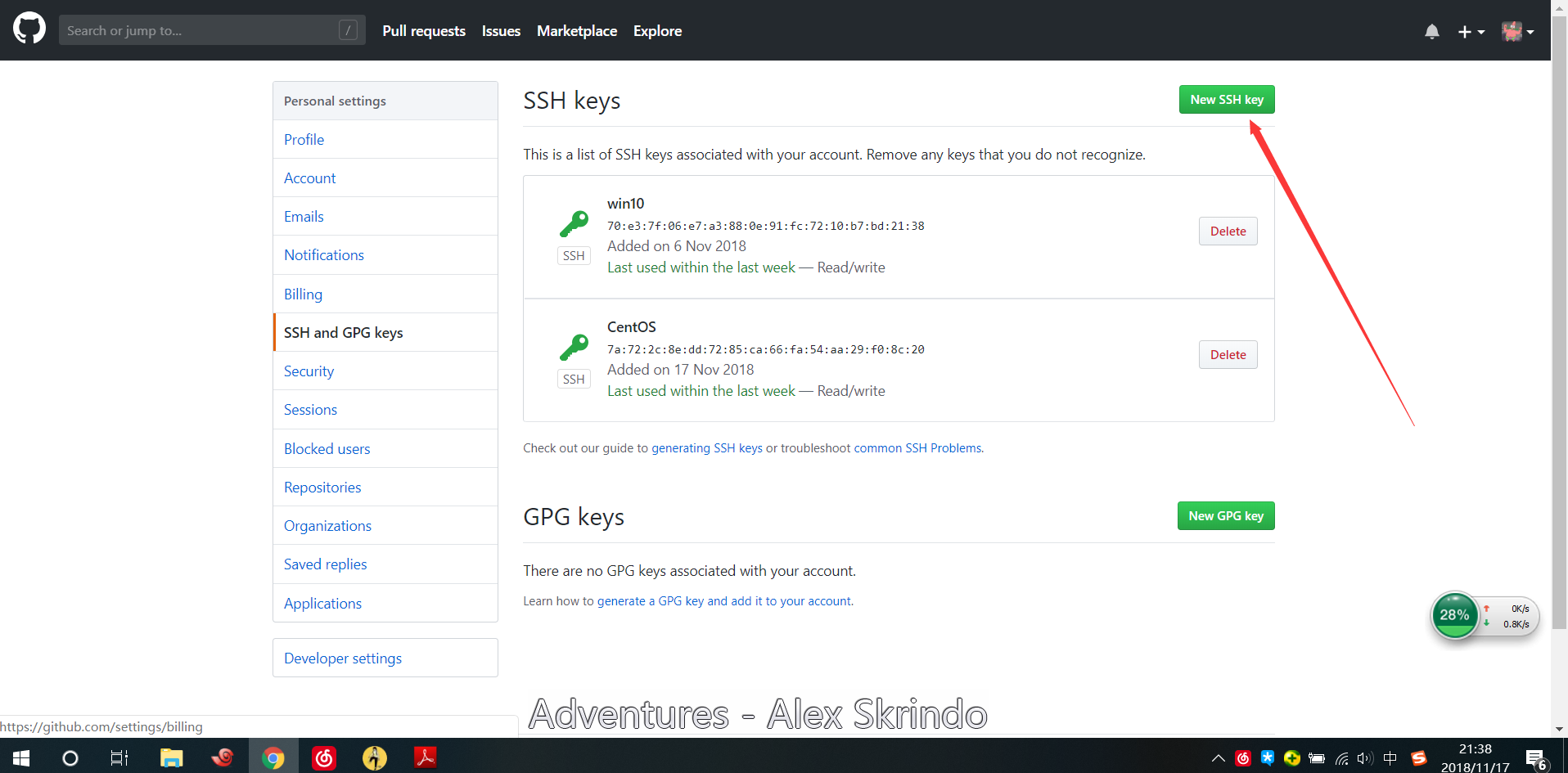下通过cat命令应该可以看到生成的秘钥,添加到GitHub(这里以Github为例)的秘钥中!
