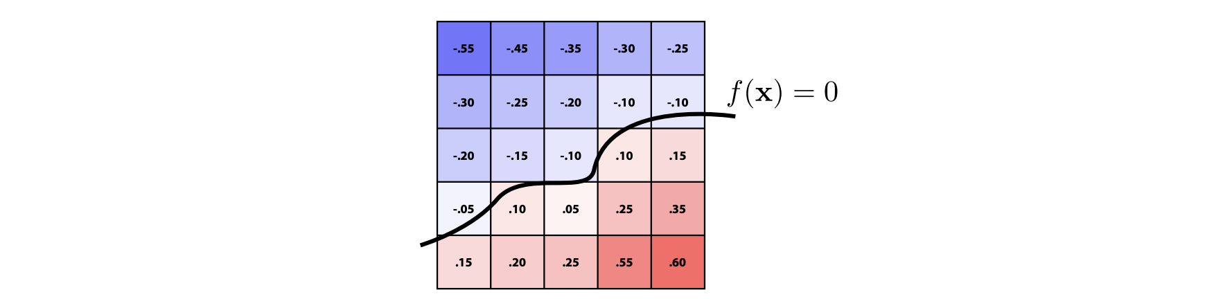 水平集的方法其实与 SDF 很像 (像是SDF的一种特殊形式),也是找出函数值为 0 的地方作为曲线,但不像 SDF 会空间中的每一个点有一种严格的数学定义,而是对空间用一个个格子去近似一个函数,如下: