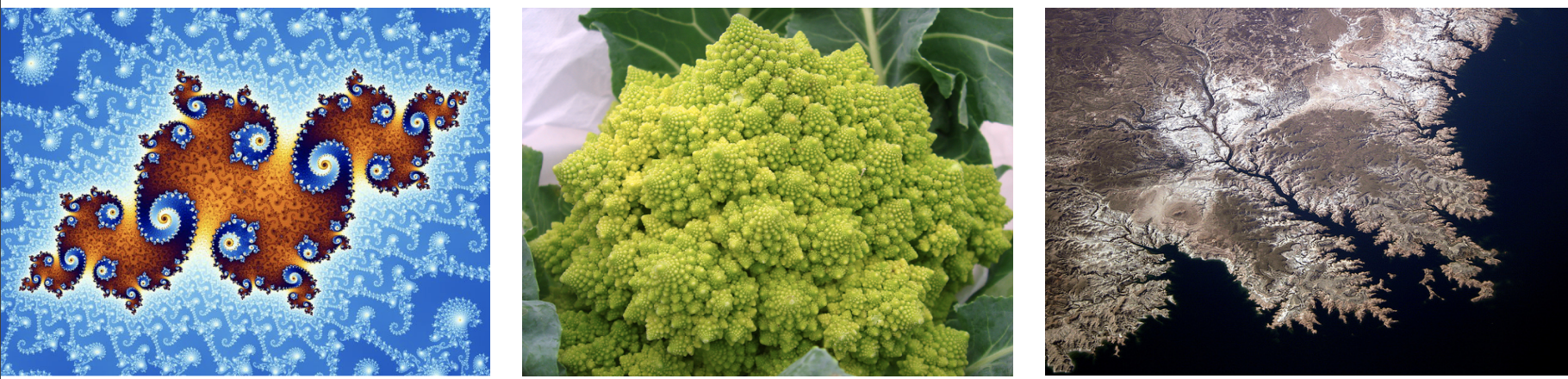 如雪花是一个六边形,放大之后会发现每一个边上又是一个六边形,再放大六边形边上的六边形边上又是六边形,就这样无限套娃,有点递归的意思。