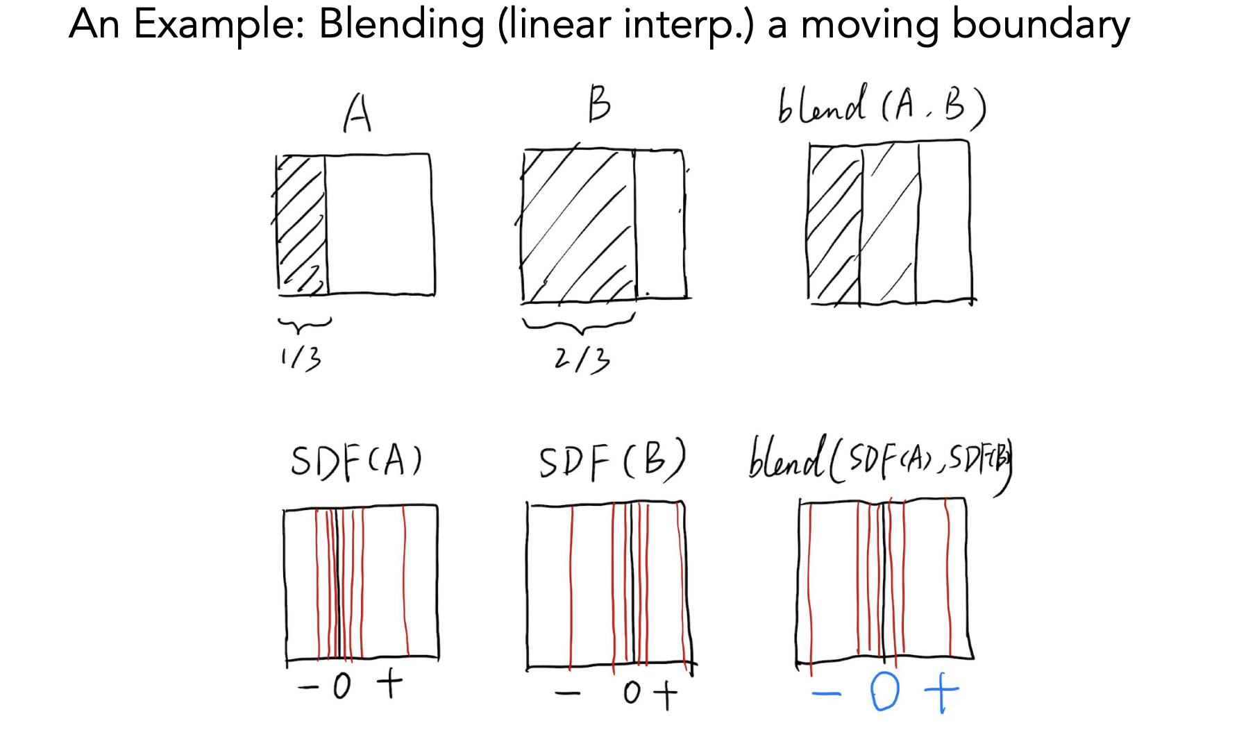 对于这样一个二维平面的例子,定义空间中每一个点的 SDF 为该点到阴影区域右边界的垂直距离,在阴影内部为负,外部为正,因此对于A和B两种阴影来说的SDF分别如上图下半部分所示。有了 SDF(A)、SDF(B) 之后对这两个距离函数选择性的做一些运算得到最终的距离函数,这里采用最简单的 SDF = SDF(A) + SDF(B) 来举例,最终得到的 SDF 为零的点的集合即为混合之后的曲面,对该例子来说,就是两道阴影之间中点的一条线。