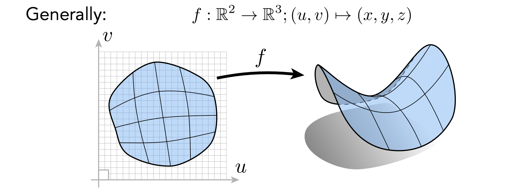 对于显式曲面来说是与隐式曲面相对应的,所有曲面的点被直接给出,或者可以通过映射关系直接得到,如下图:
