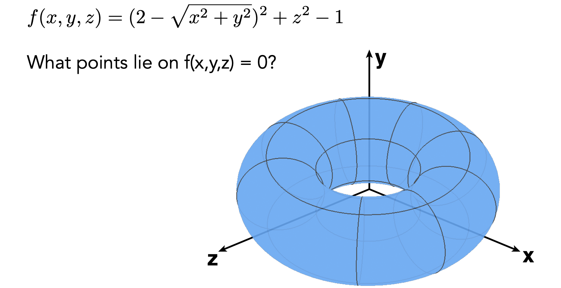所谓隐式曲面指的是并不会告诉你任何点的信息,只会告诉你该曲面上所有点满足的关系。来举个具体的隐式曲面的例子: $$ \mathrm{x}^{2}+\mathrm{y}^{2}+\mathrm{z}^{2}=1 $$ 相信读者都能一眼看出来这是一个三维球体的方程,一般地的我们会把隐式曲面的代数方程写作 $f(x,y,z)=0$ ,该球体的 $f(x,y,z)=\mathrm{x}^{2}+\mathrm{y}^{2}+\mathrm{z}^{2}=1$ ,对于隐式方程来说因为没有给出任何点的信息,因此如何采样到曲面上具体的点是一个很难的问题,如下图这样一个例子: