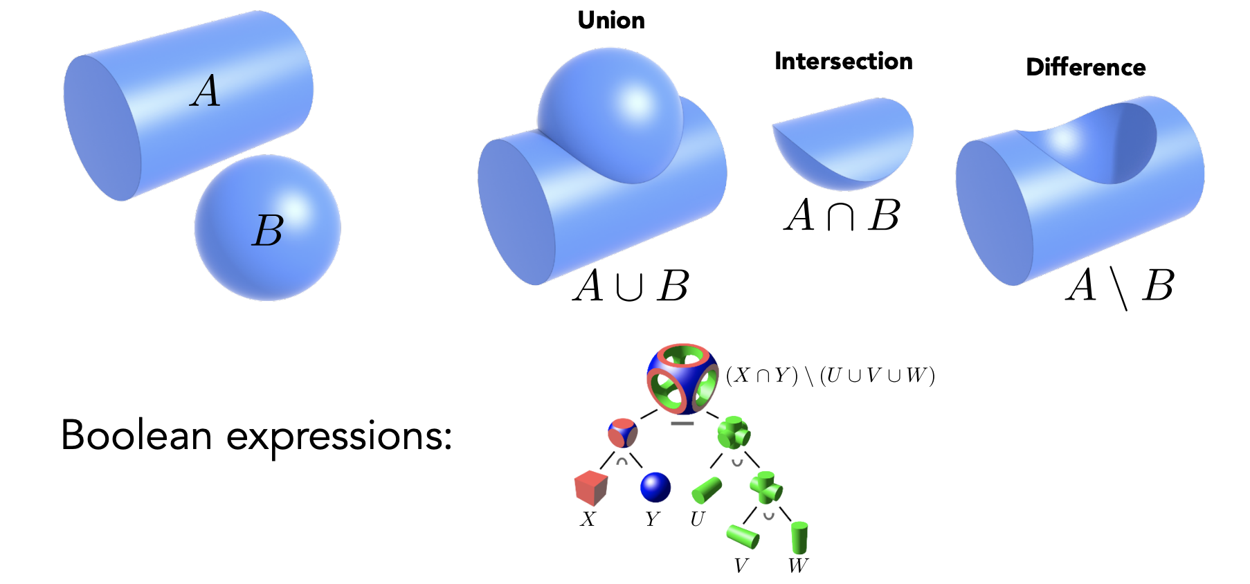 CSG指的是可以对各种不同的几何做布尔运算,如并,交,差。通过这些操作可以得出各种更为复杂的几何: