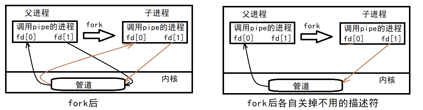 - 只能用于具有共同祖先的进程(具有亲缘关系的进程)之间进行通信;通常一个管道由一个进程创建,然后该进程调用fork,此后父、子进程之间就可应用该管道。