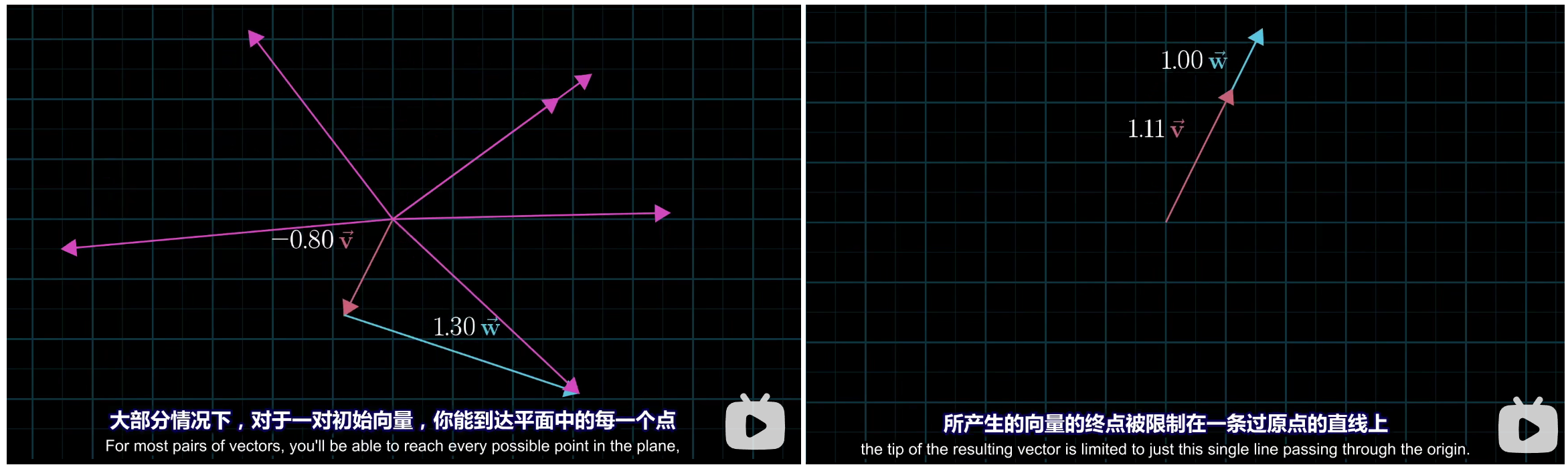 前面提到的第三个向量恰好落在前两个向量张成的平面上的情况,还有两个向量共线的情况,都是其中至少有一组向量是多余的,即不会对张成的空间做出任何贡献,去掉其中一个向量也不会减少张成的空间,那么就认为这组向量是线性相关的,否则就是线性无关的: