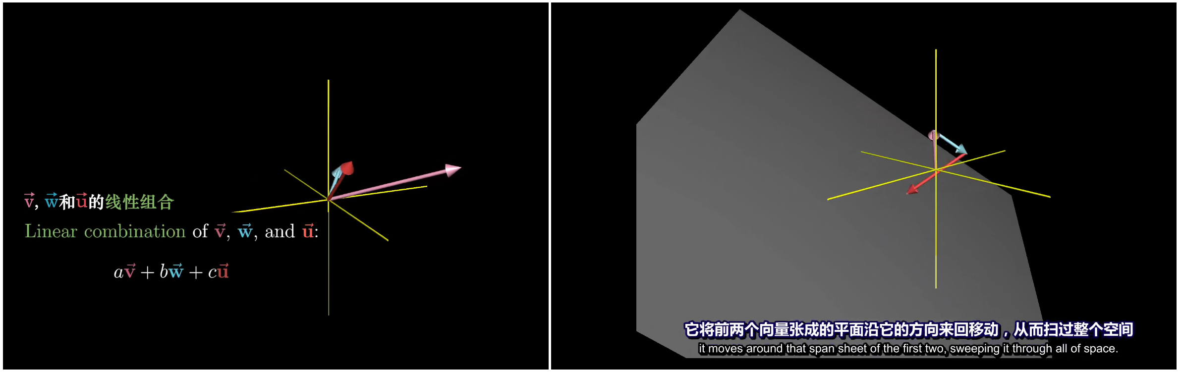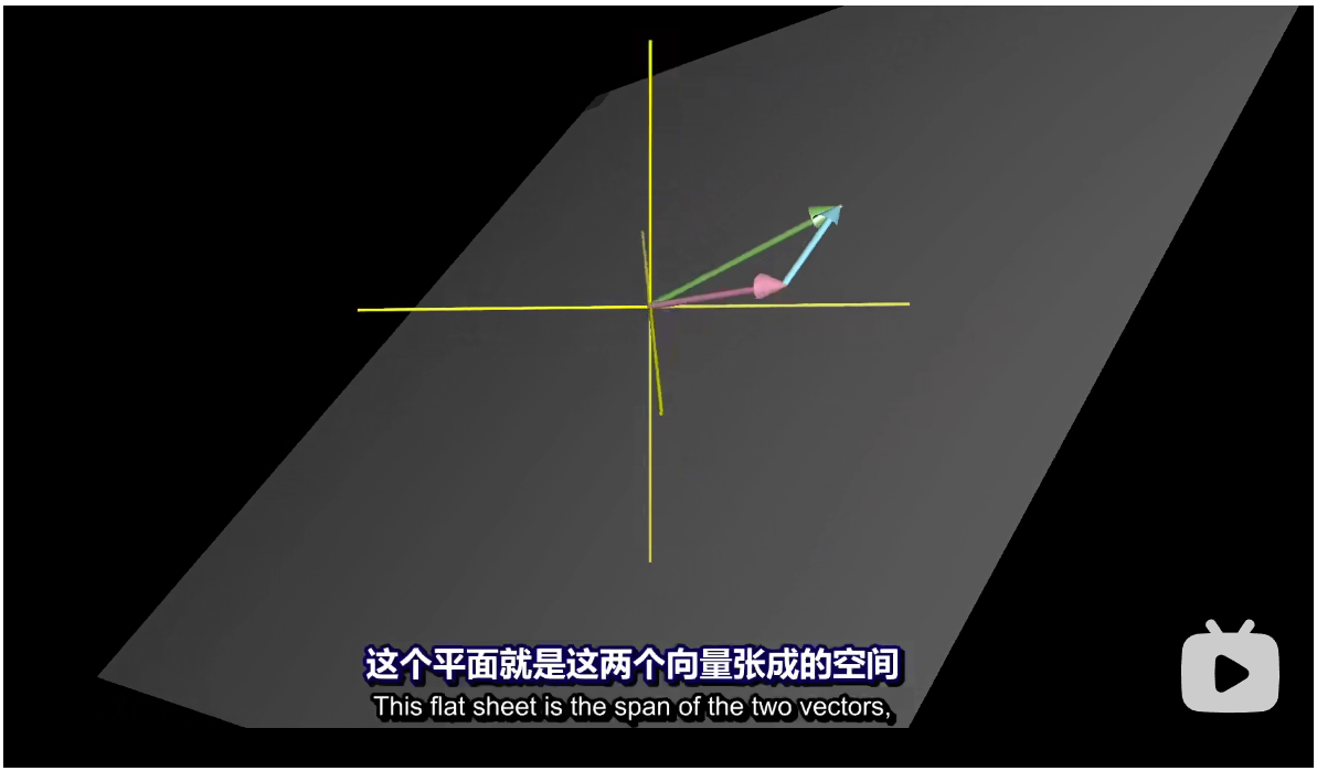 现在加入第三个向量,如果这第三个向量恰好落在前两个向量张成的平面上,无论怎么做线性组合,所张成的空间依旧是这个二维平面,张成的空间并没有发生改变。但是如果选择第三个向量没有落在前两个向量张成的平面上,则张成的空间会是整个三维空间: