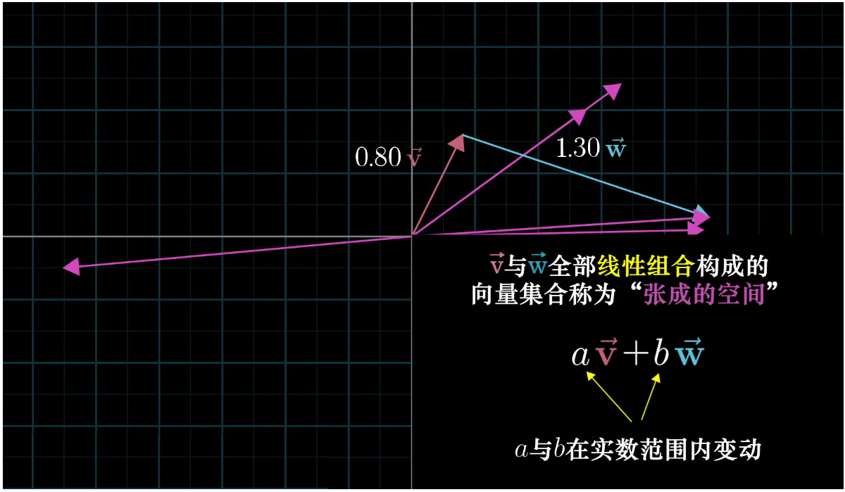 所以两个向量张成的空间实际上就是在问:仅仅通过向量加法和向量数乘这两种基础的运算,你能得到的所有可能的向量集合是什么?