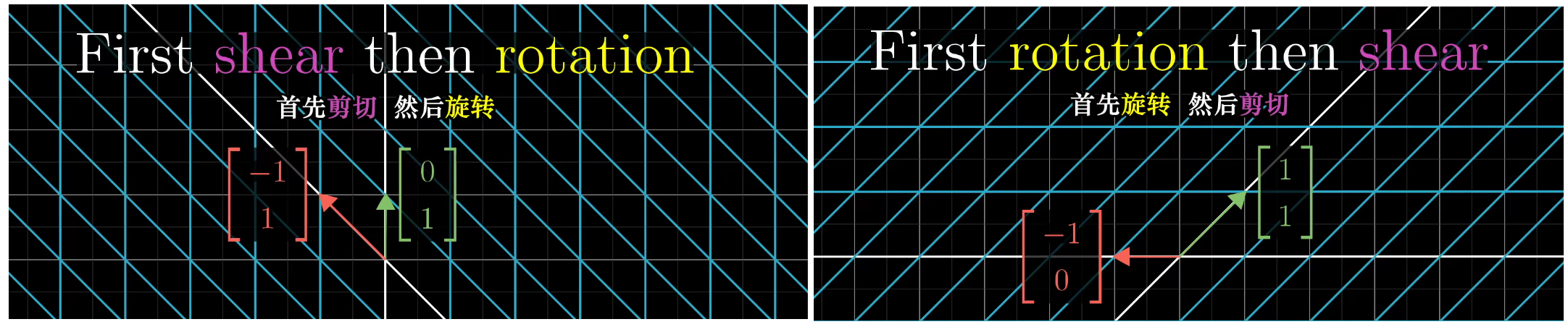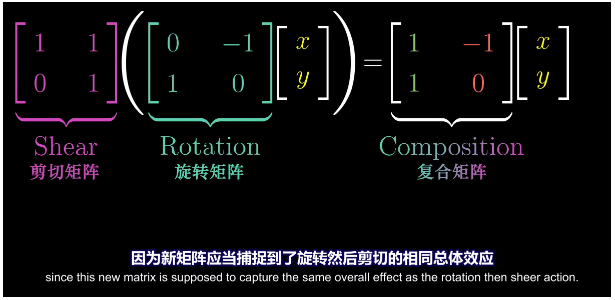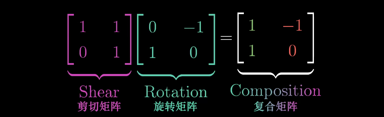 $\left[ \begin{matrix} 1 & 1 \ 0 & 1 \end{matrix} \right] $ 这样的两步变换,还是只经过一次 $\left[ \begin{matrix} 1 & -1 \ 1 & 0 \end{matrix} \right] $ 这样的变换,最终得到的最终效果是一样的,现在假设有向量$\left[\begin{matrix}x\y\end{matrix} \right]$,先被旋转矩阵变换,然后被剪切矩阵变换,与直接被复合矩阵变换效果等同,因为新的复合矩阵应当捕获到了先旋转再剪切的相同总体效应: